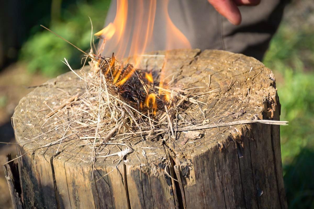 Zunder glimmt auf einem Baumstumpf, kleine Flamme sichtbar