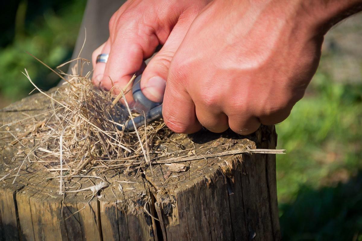 Messer schneidet Zunder auf einem Holzstück im Gras