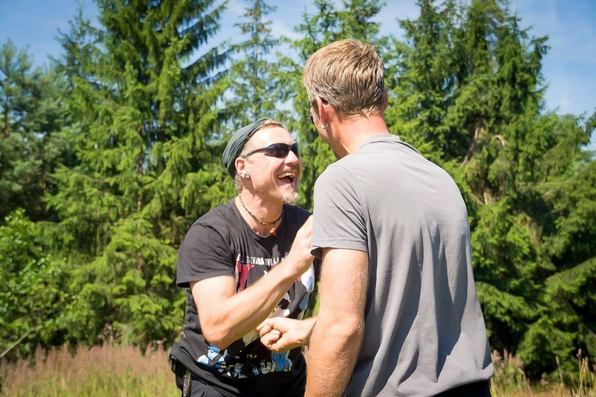 Zwei Männer lachen und interagieren in einer Waldumgebung