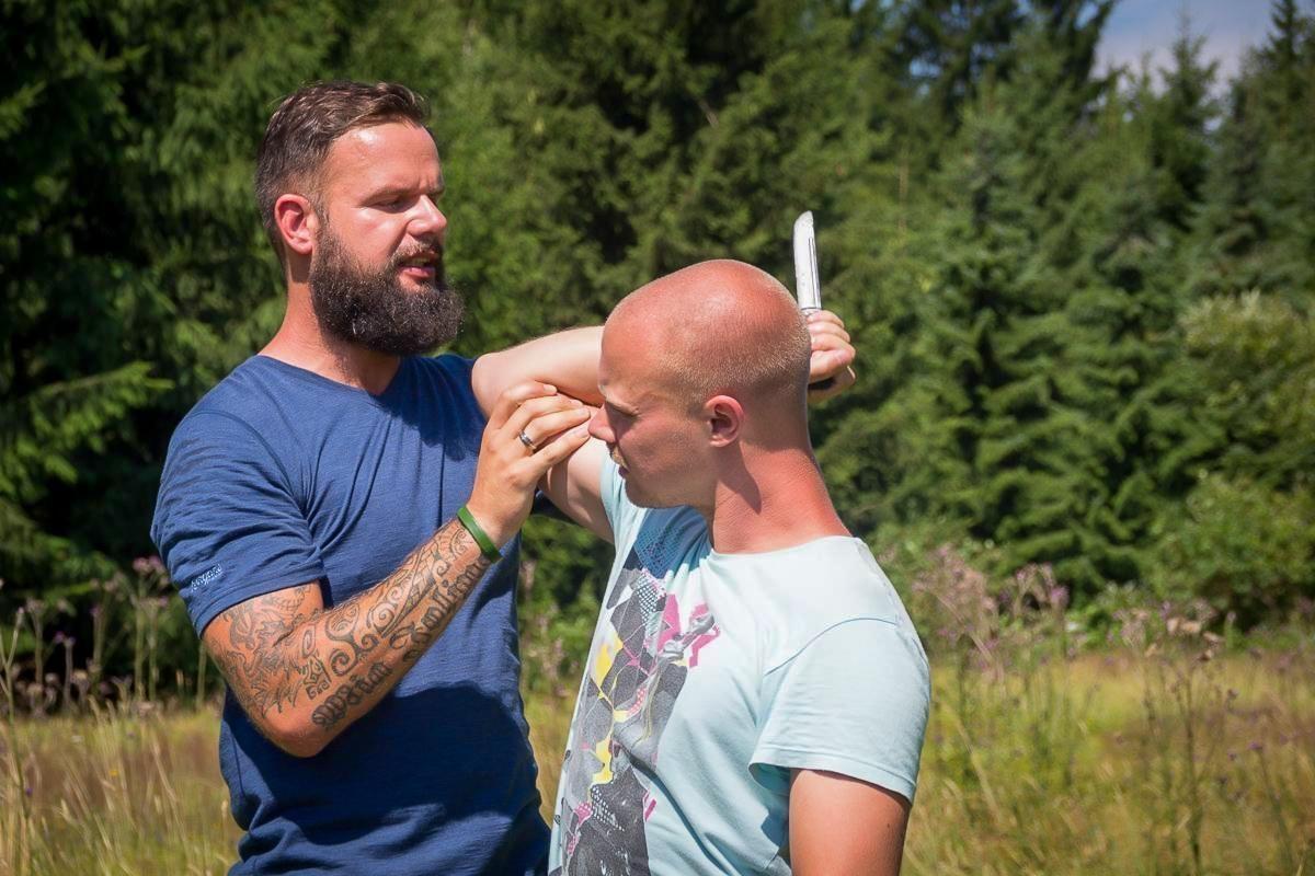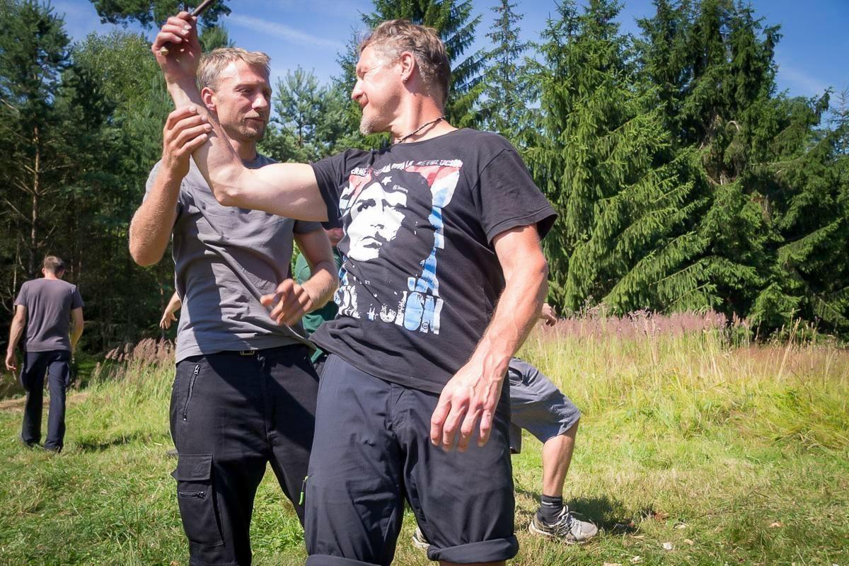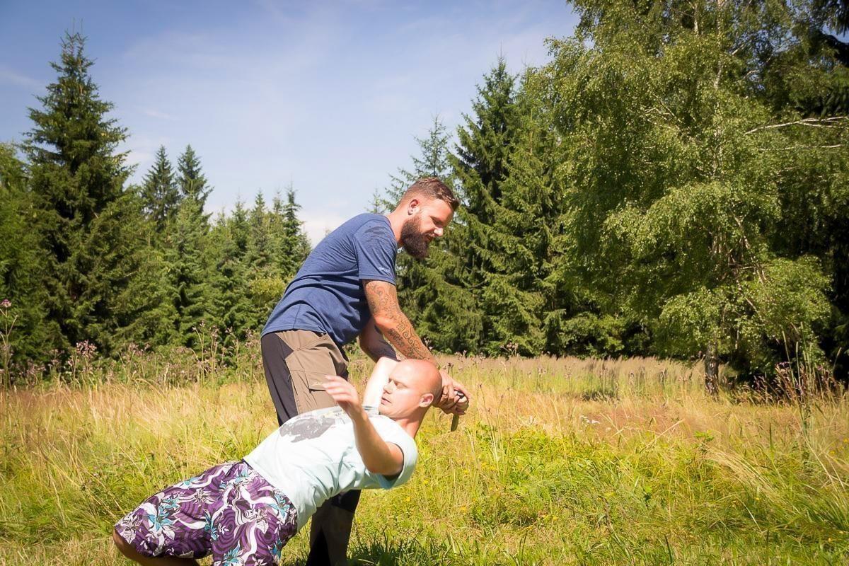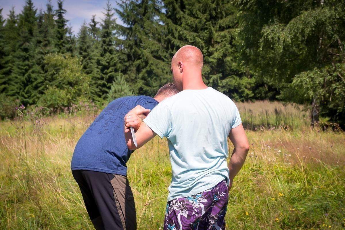 Zwei Personen üben eine Selbstverteidigungstechnik im Freien mit einem Messer