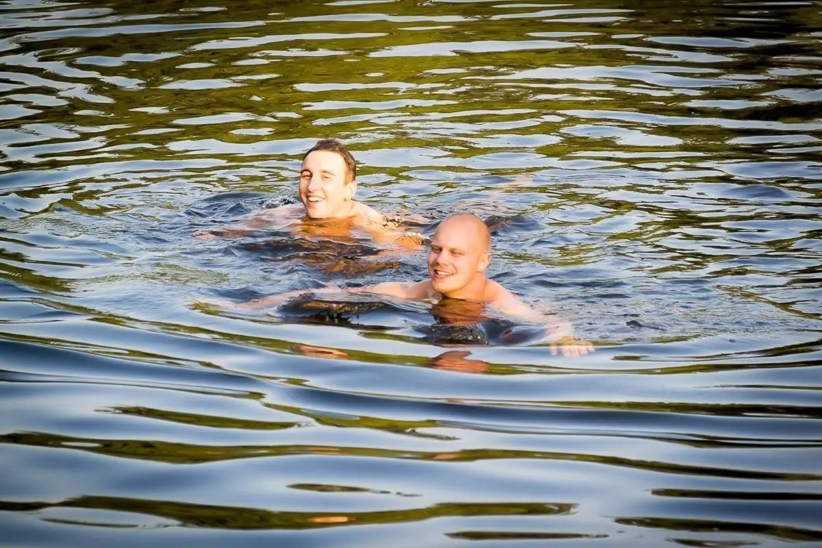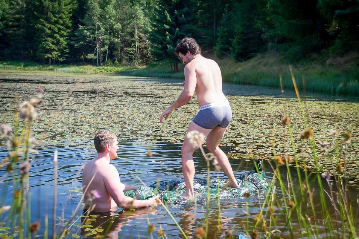 Gruppenschwimmen in einem klaren Gewässer mit Pflanzenbewuchs am Ufer