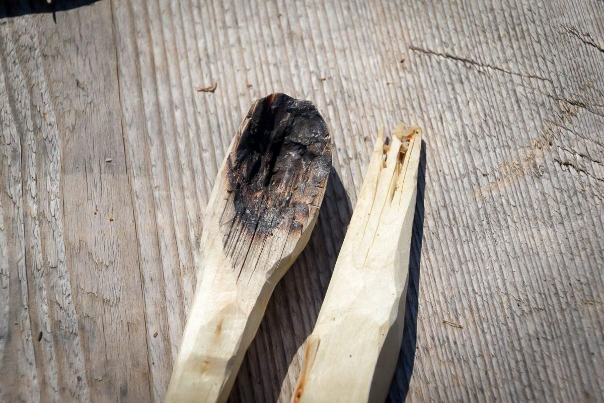 Zwei selbstgefertigte Holzlöffel mit Brandspuren und Rissen auf einer Holzoberfläche