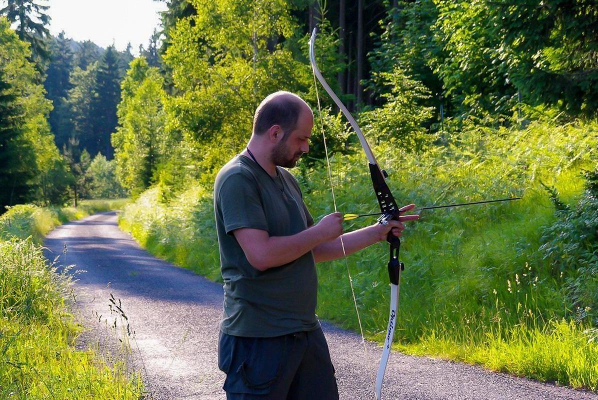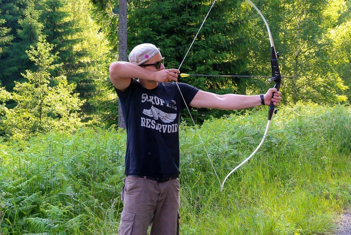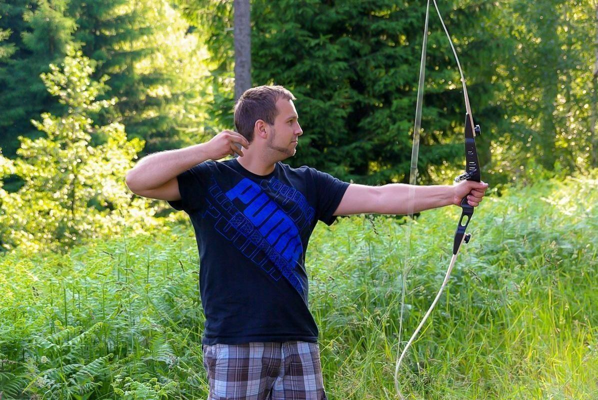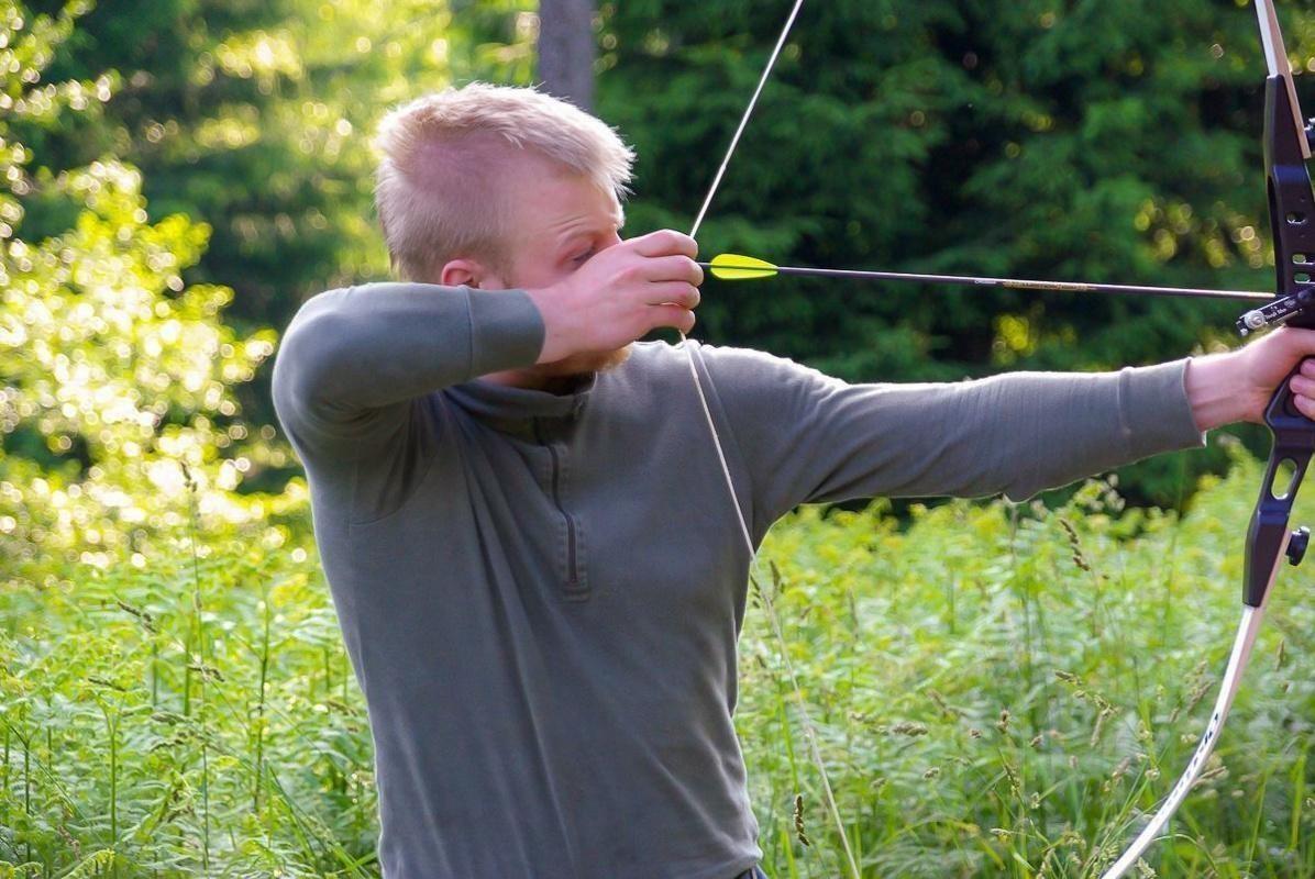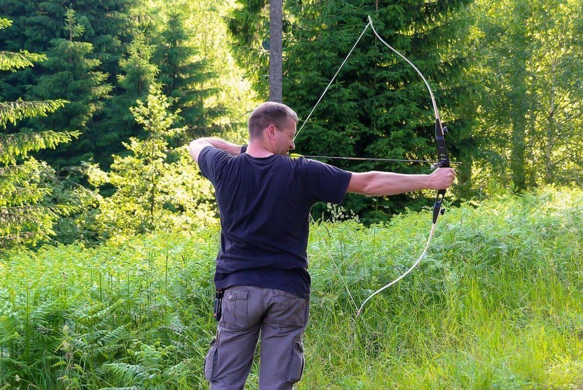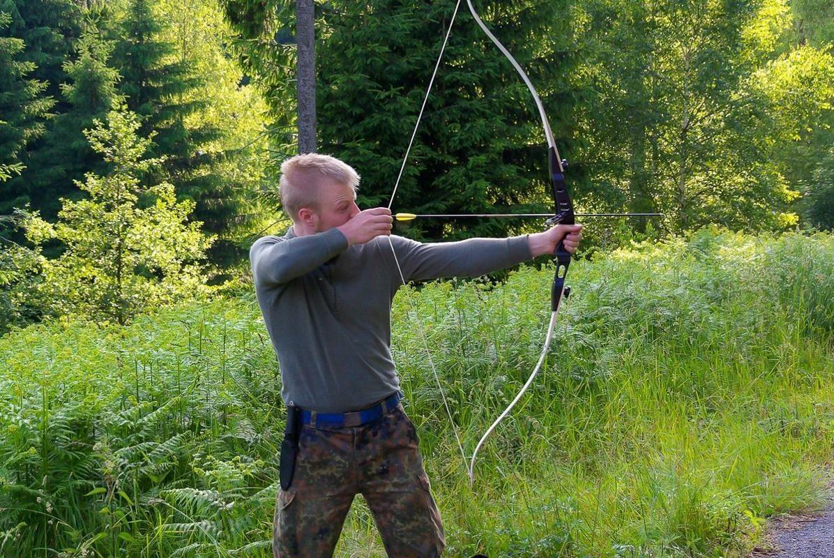 Person spannt einen Bogen in einer bewaldeten Umgebung