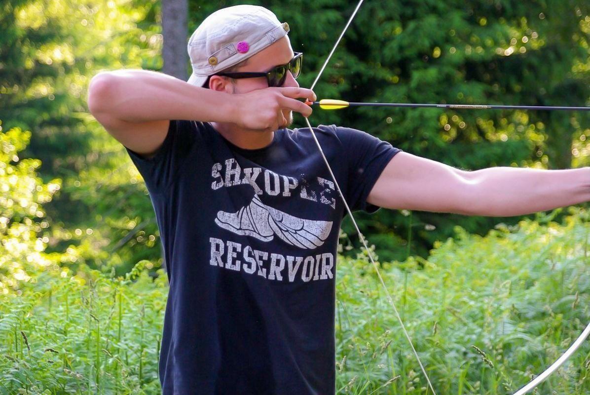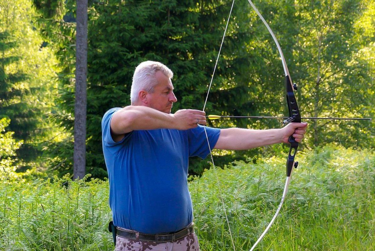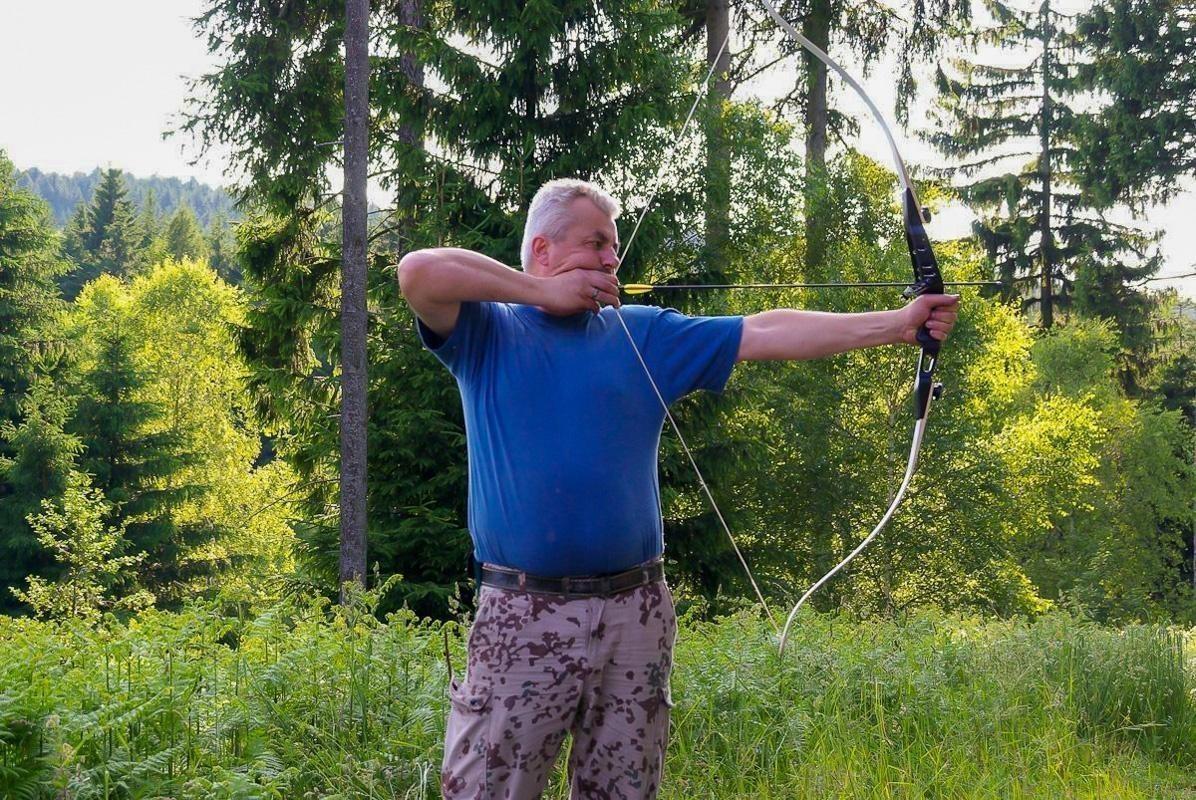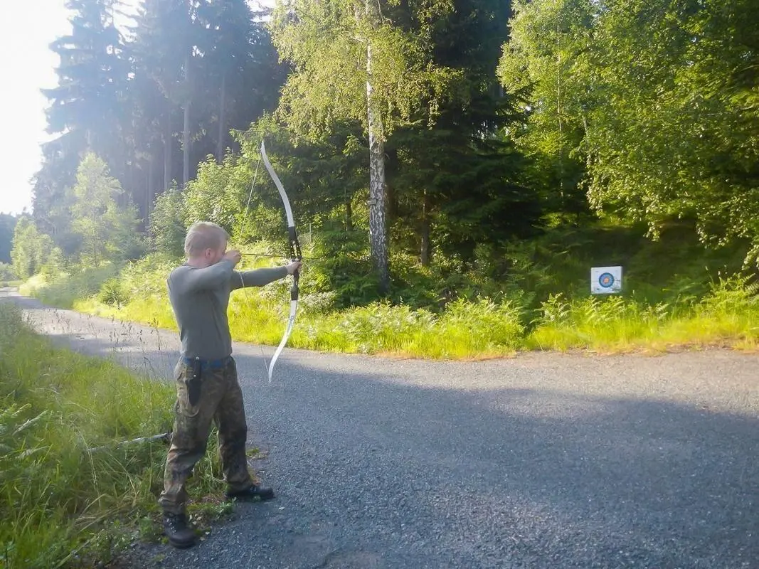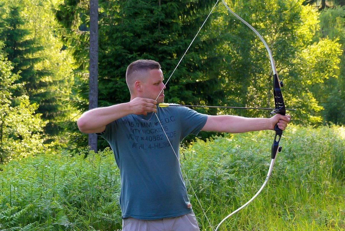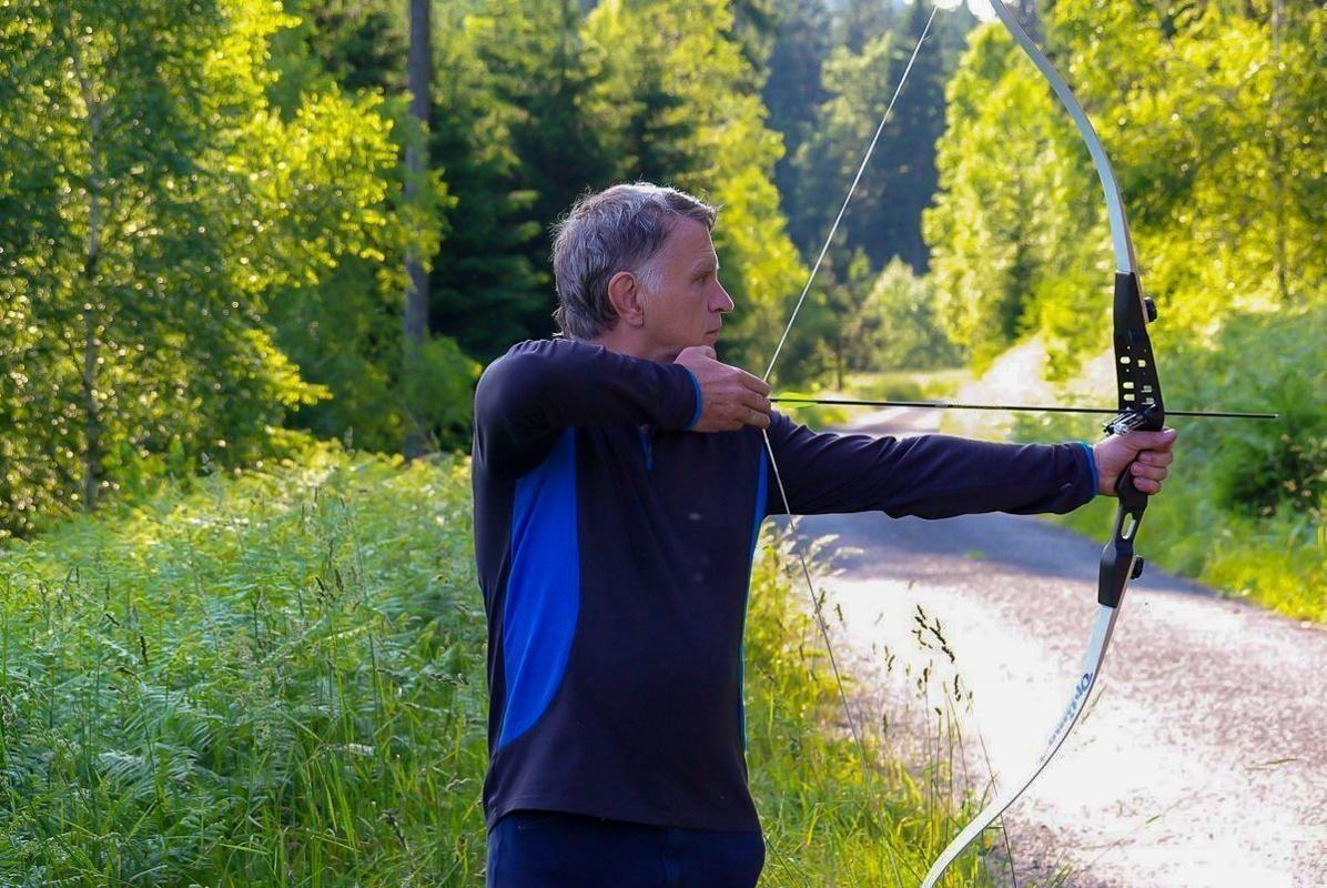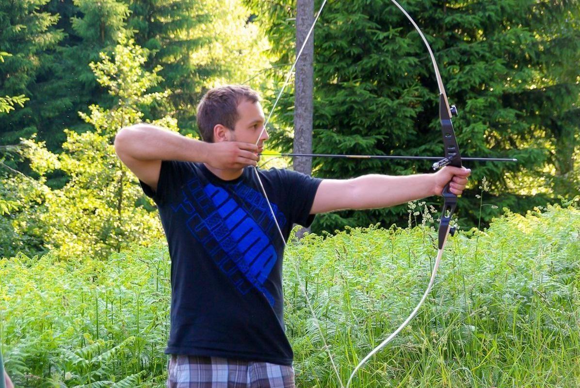Person spannt einen Bogen in einer bewaldeten Umgebung
