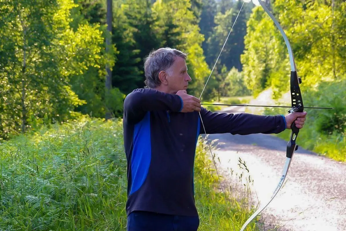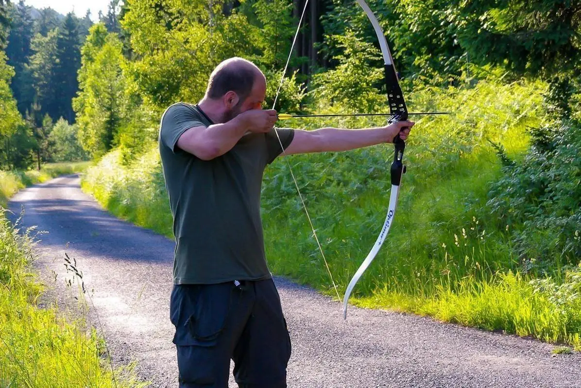 Bogenschütze spannt einen Bogen auf einem Waldweg
