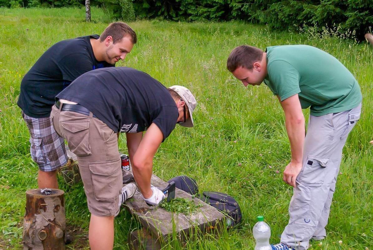 Drei Personen bearbeiten Zunder auf einem Baumstumpf im Freien
