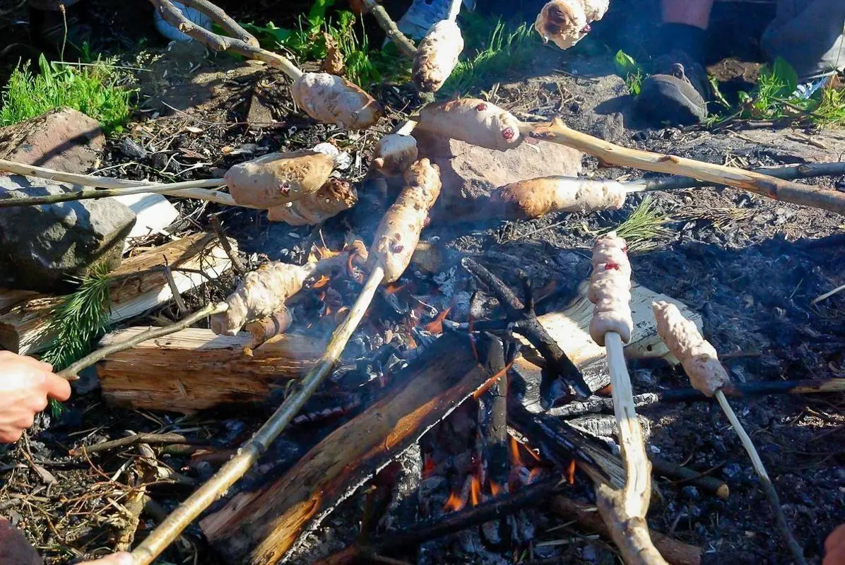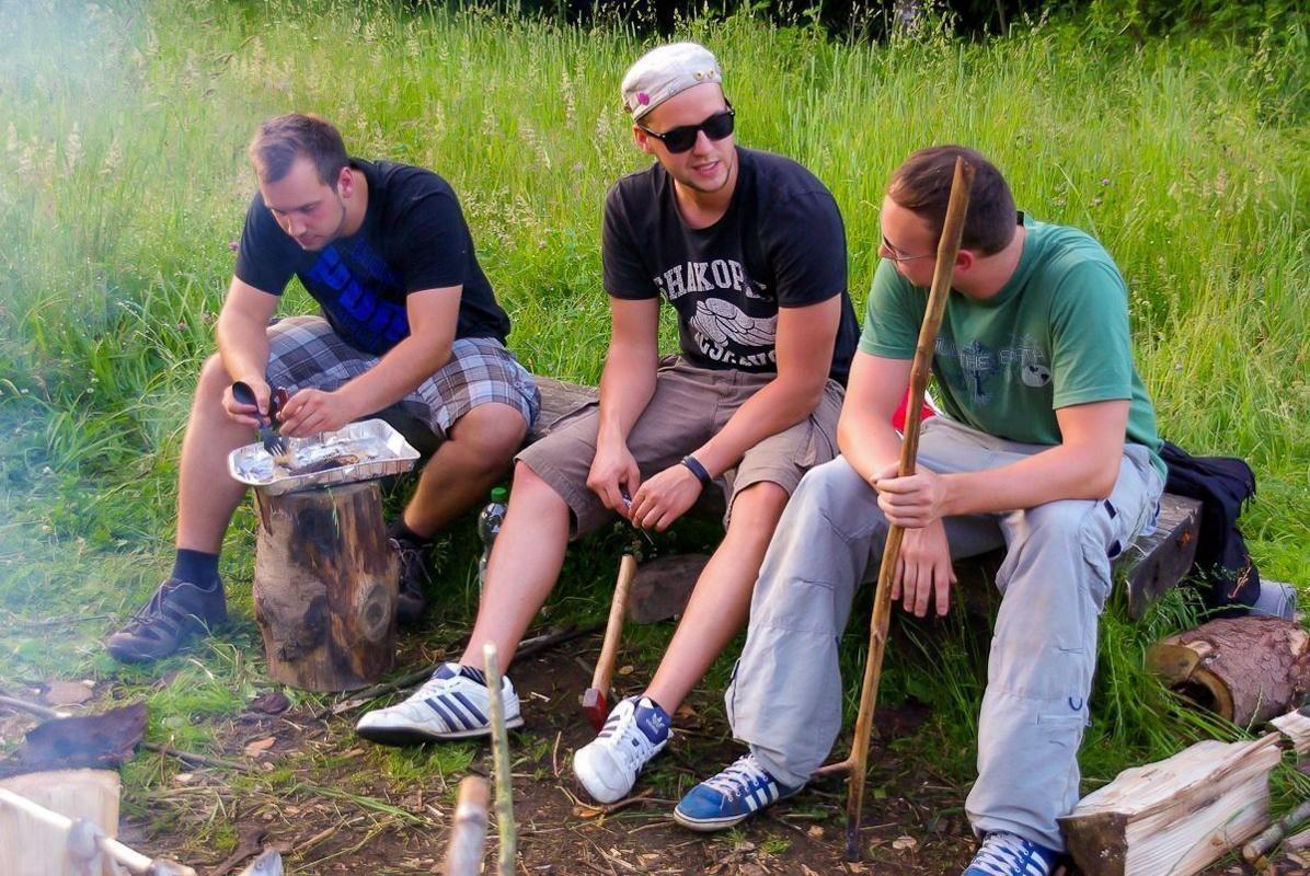 Gruppe sitzt um ein Feuer und bereitet mit Stöcken Essen zu