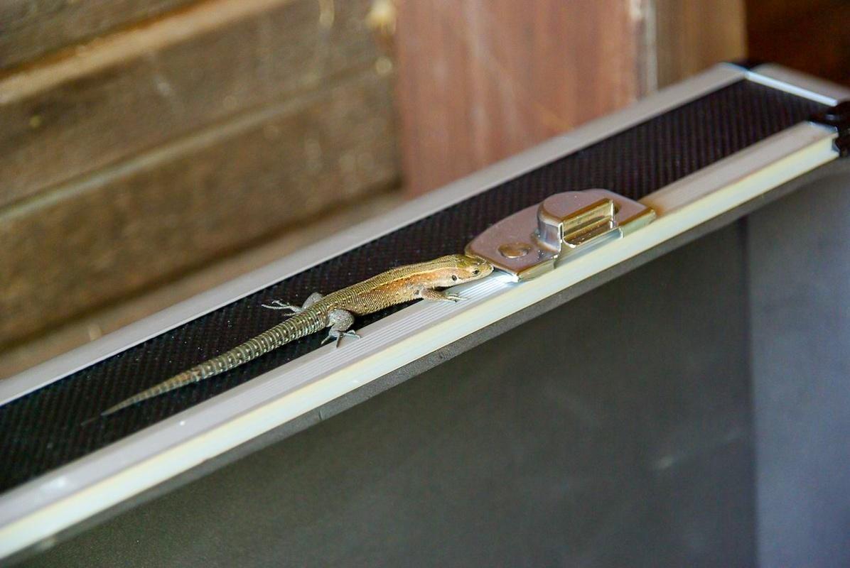 Eidechse sitzt auf einem Handtuch, das an einer Stange hängt