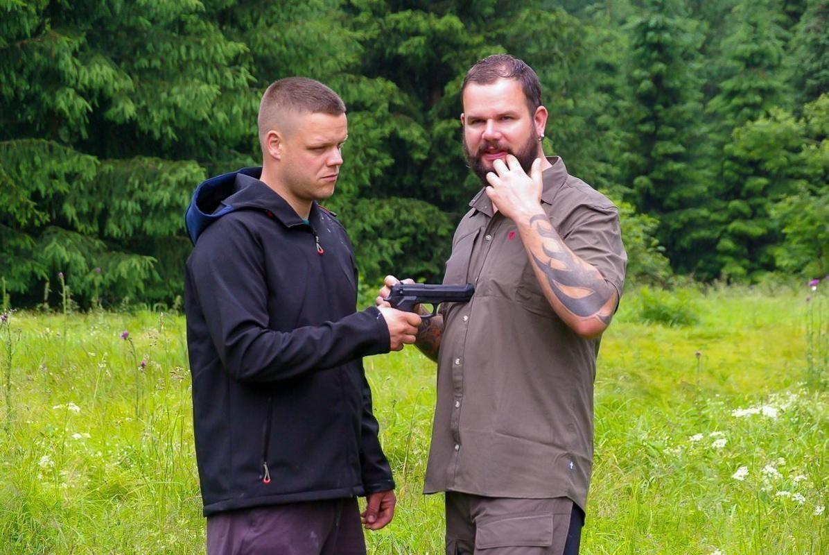 Zwei Personen halten eine Handfeuerwaffe in einem grünen Feld