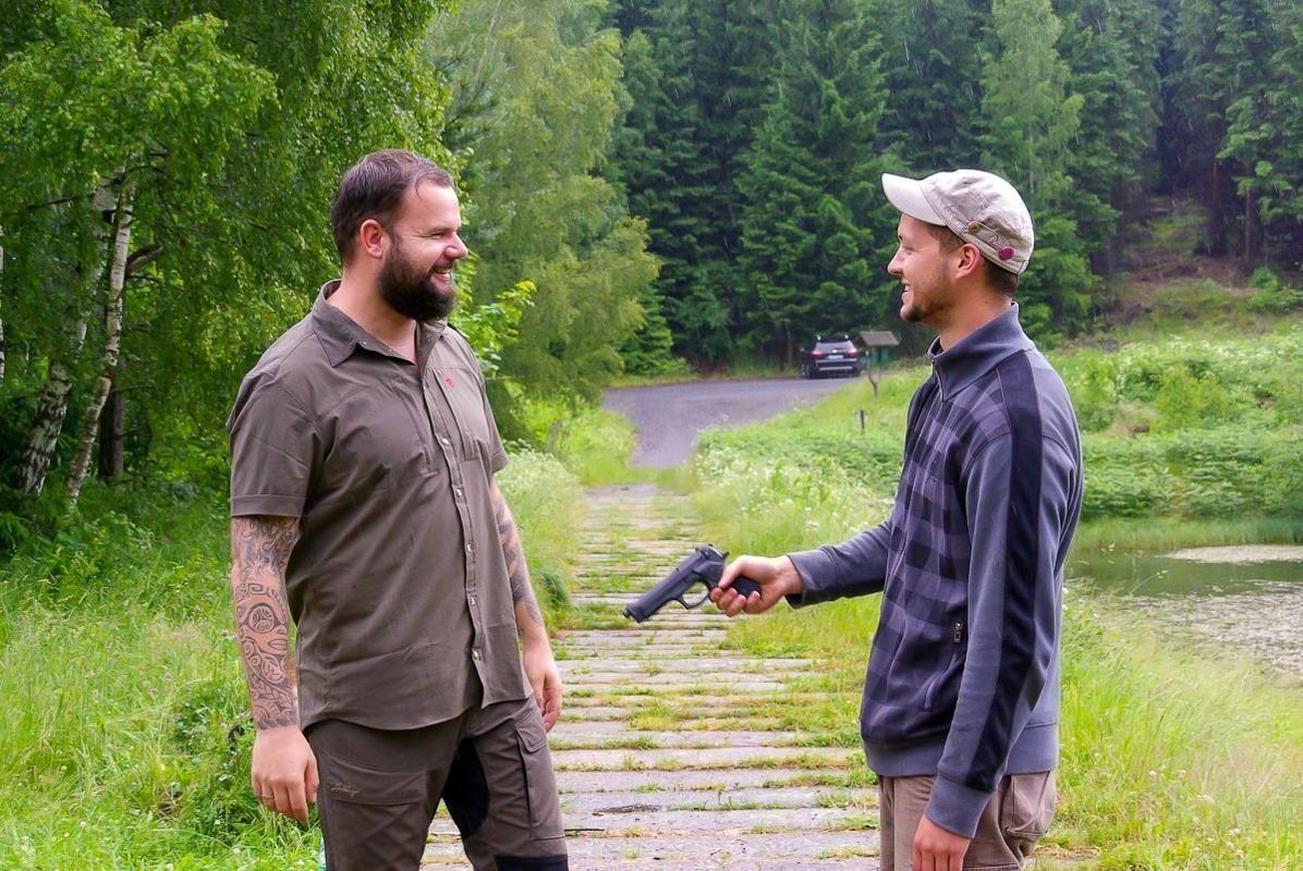 Zwei Personen stehen in einer Wiese, eine übergibt eine Pistole an die andere