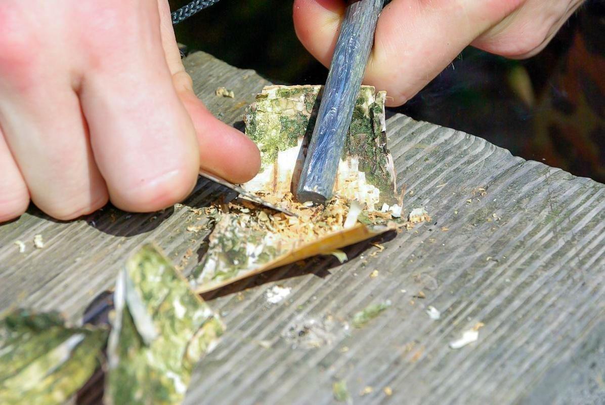 Feuerstahl erzeugt Funken auf Zunderstück aus Rinde