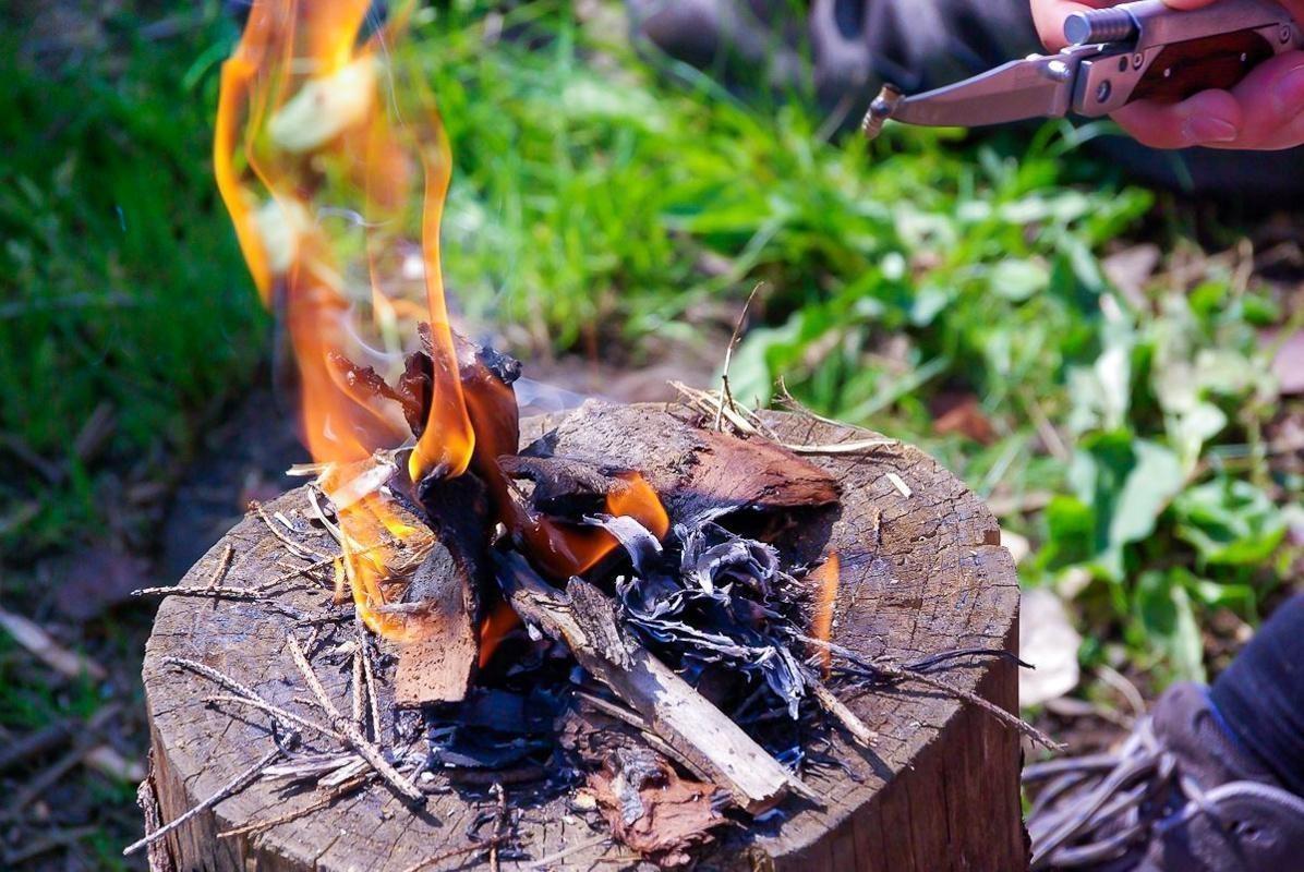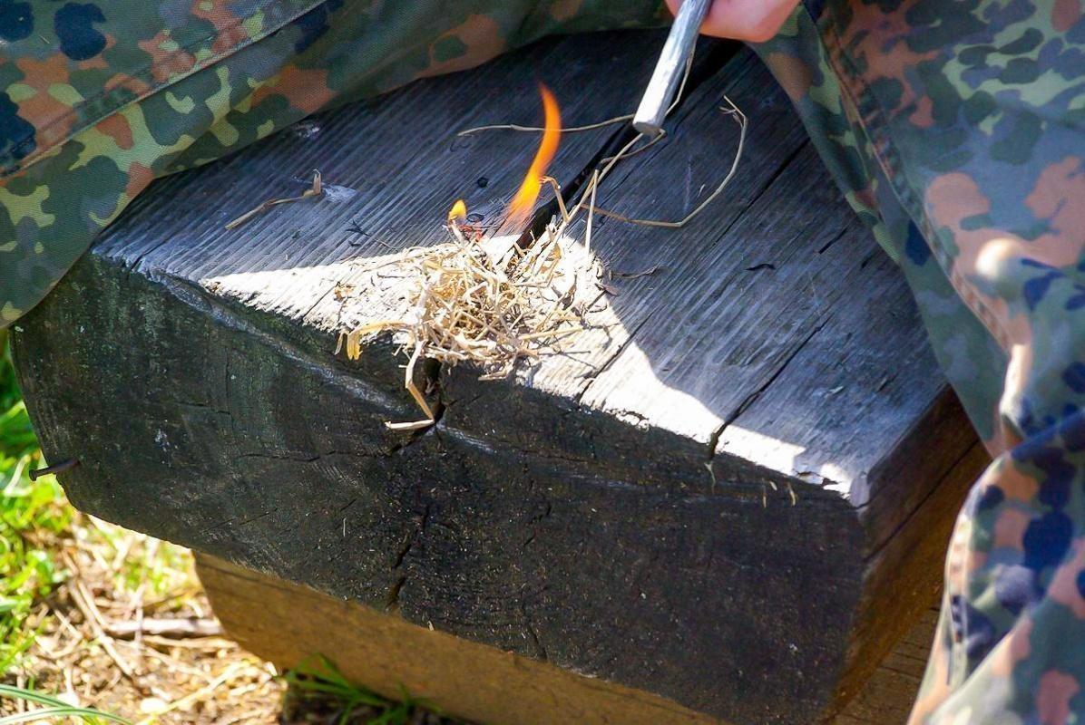 Feuerstahl erzeugt Funken auf Zunderstück auf Holzstamm