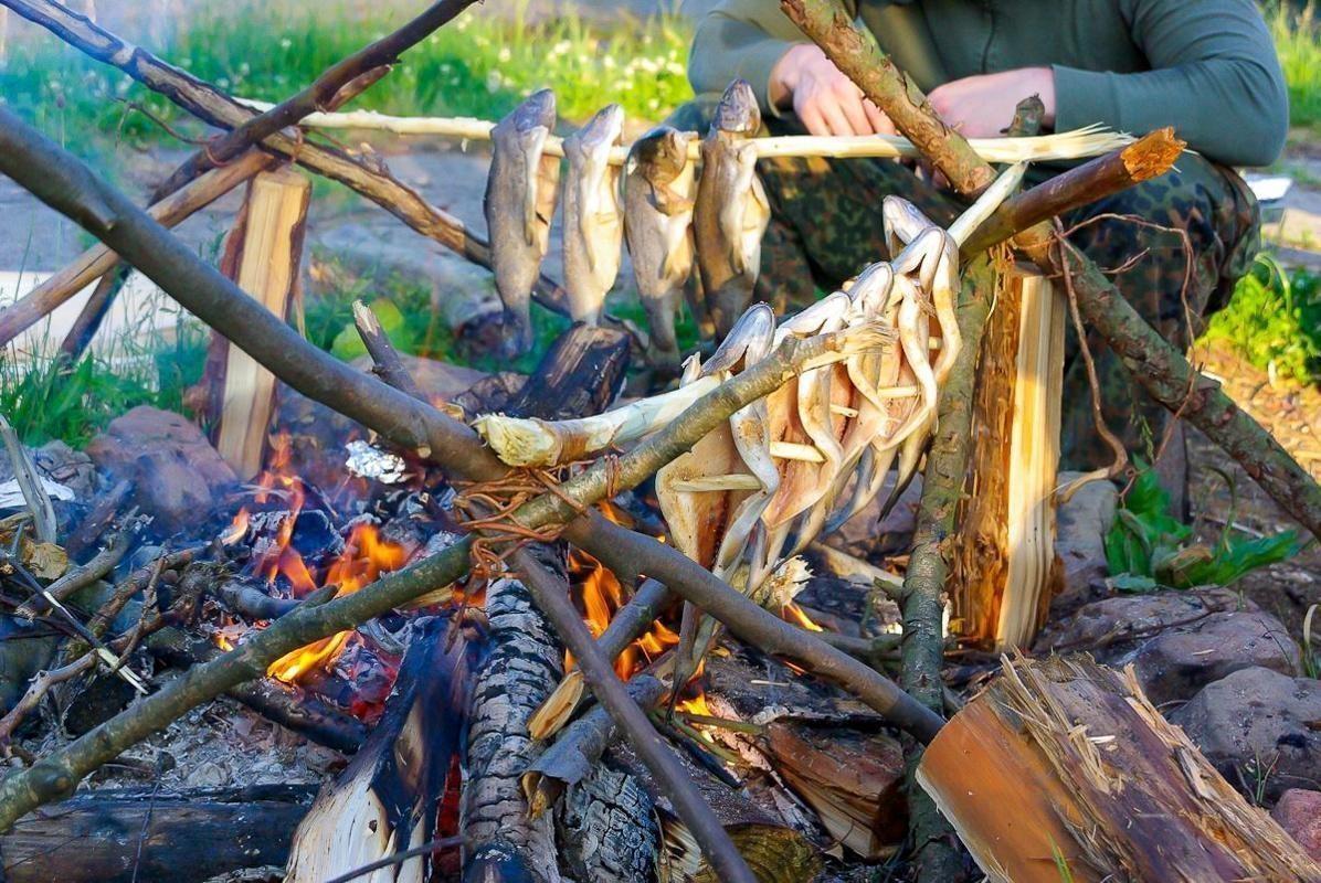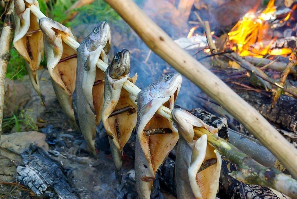 Fische hängen über einem offenen Feuer zum Garen, während Personen in der Nähe sitzen