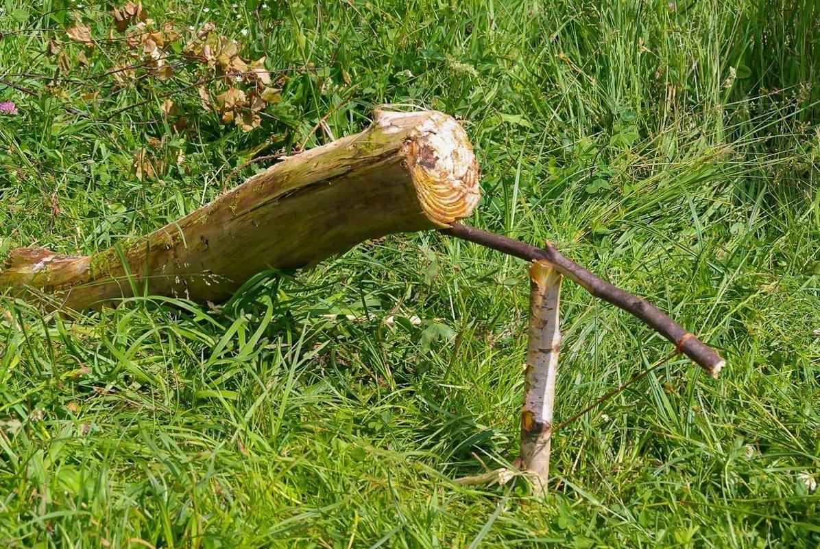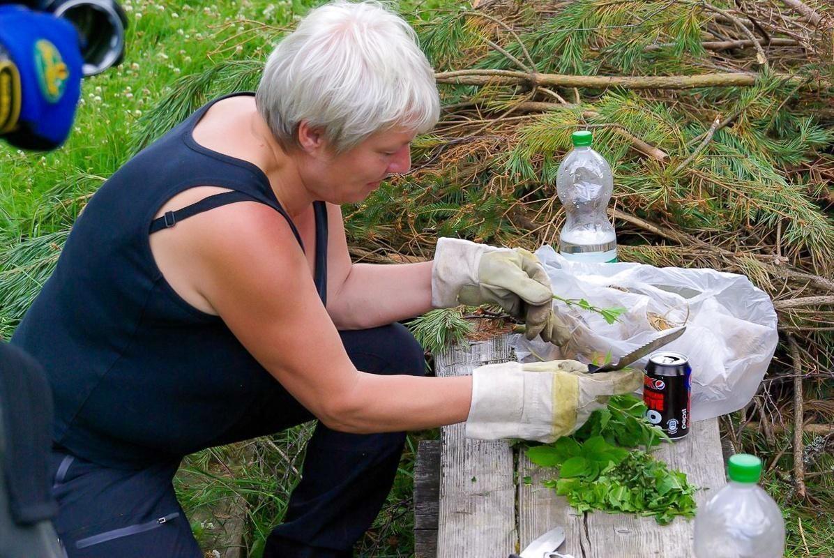Frau steht auf einer Wiese neben einem Haufen Äste und beobachtet die Umgebung