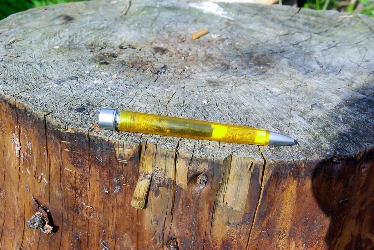 Gelber Kugelschreiber liegt auf einem Baumstumpf