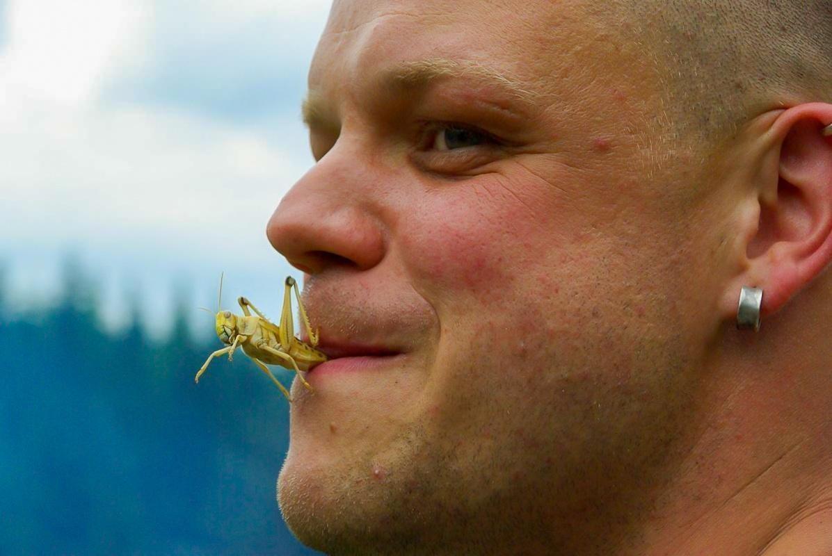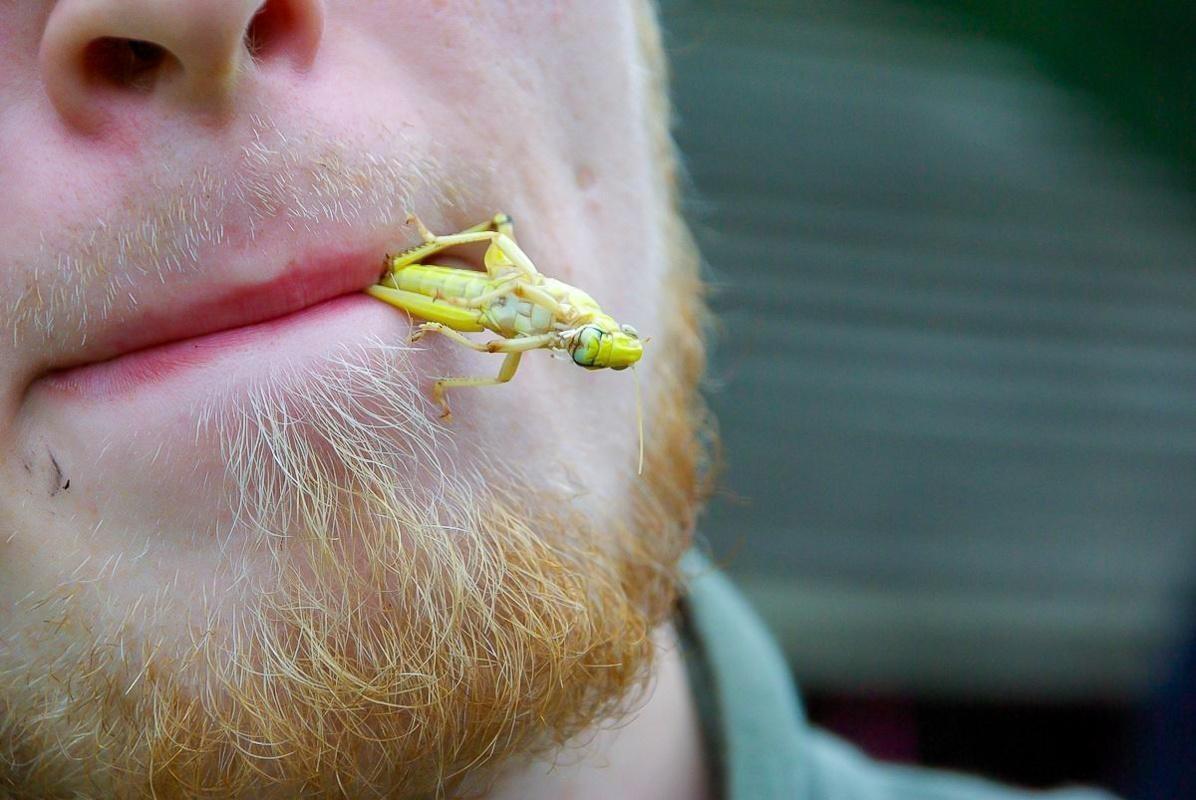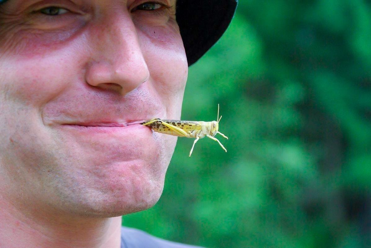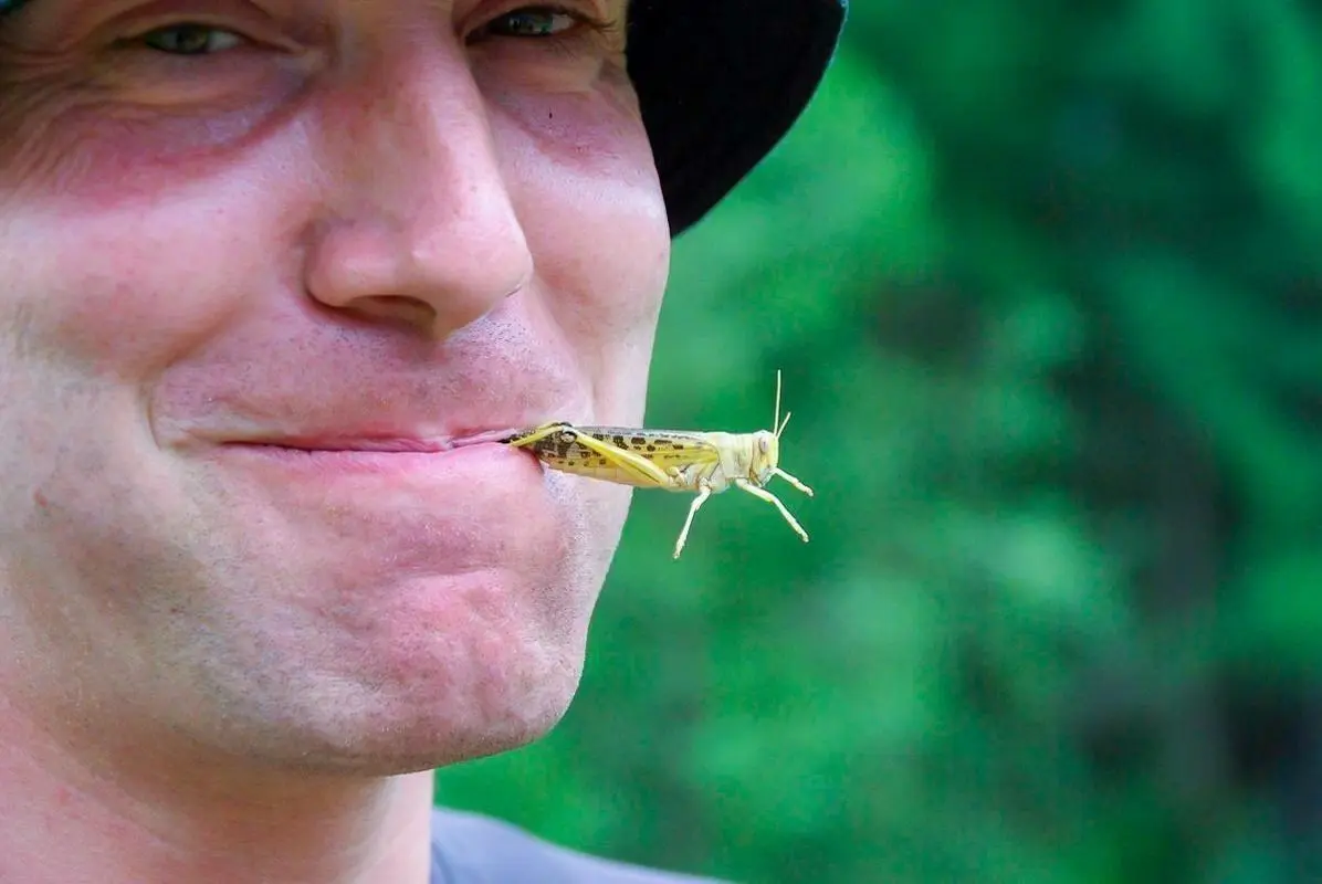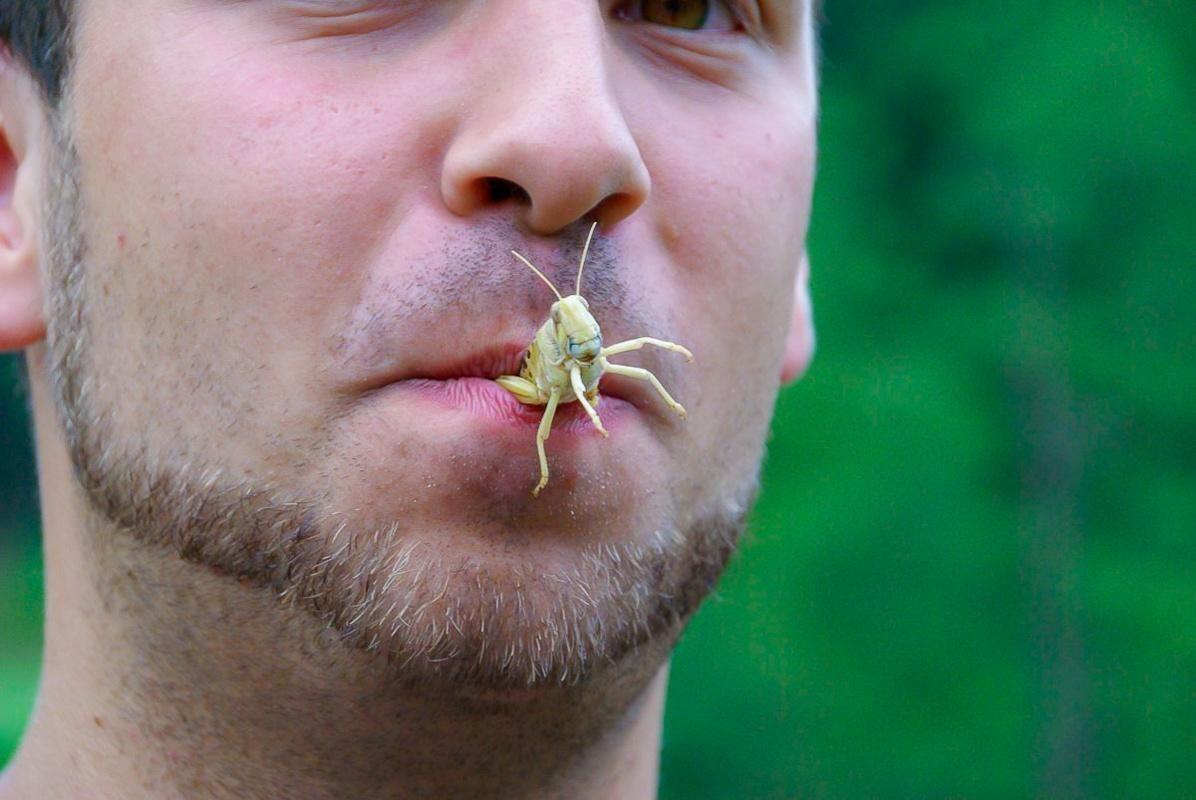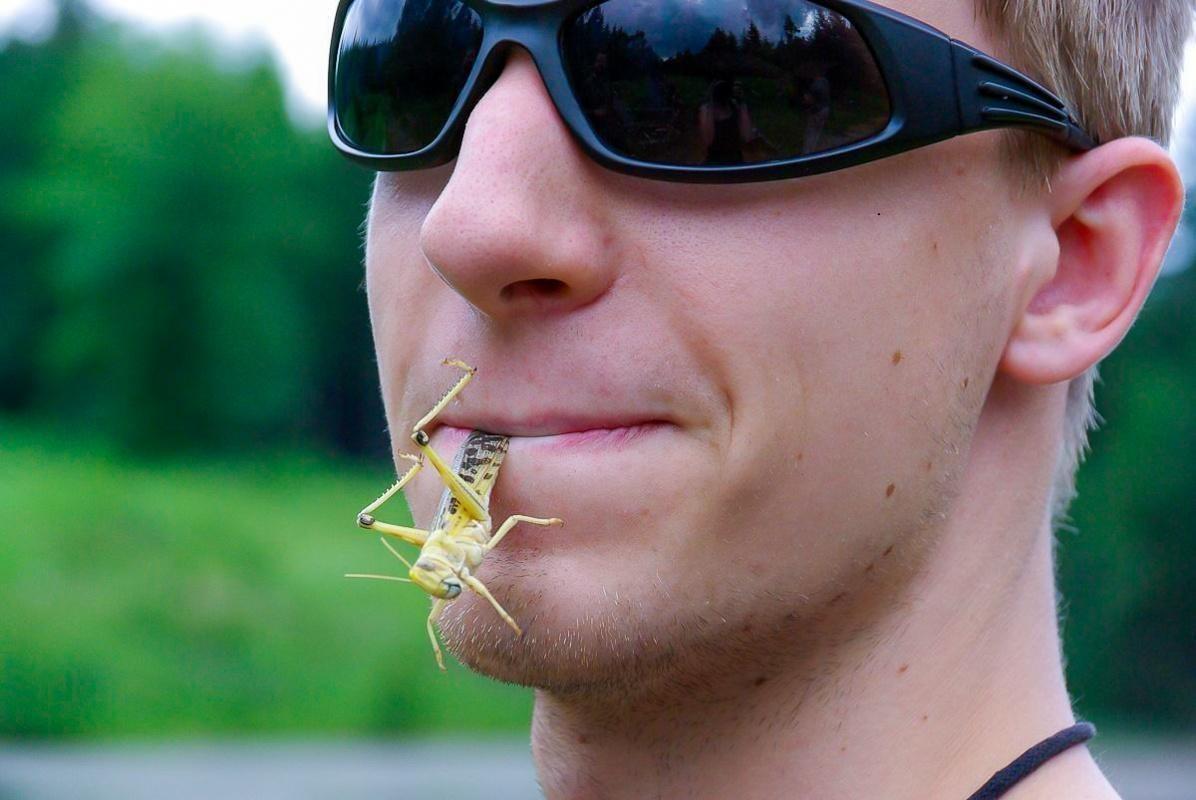 Mann mit Sonnenbrille hält eine Heuschrecke im Mund