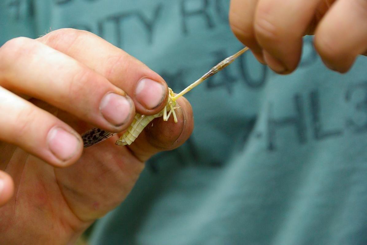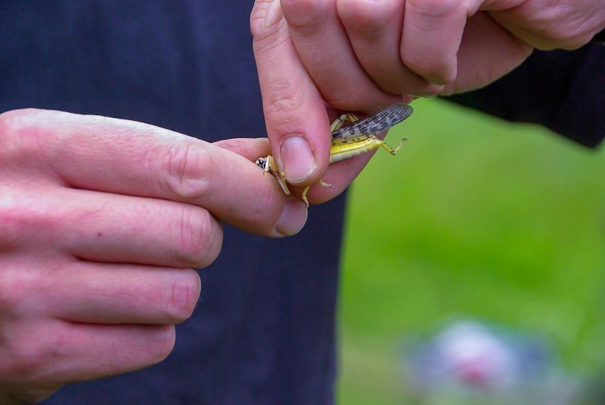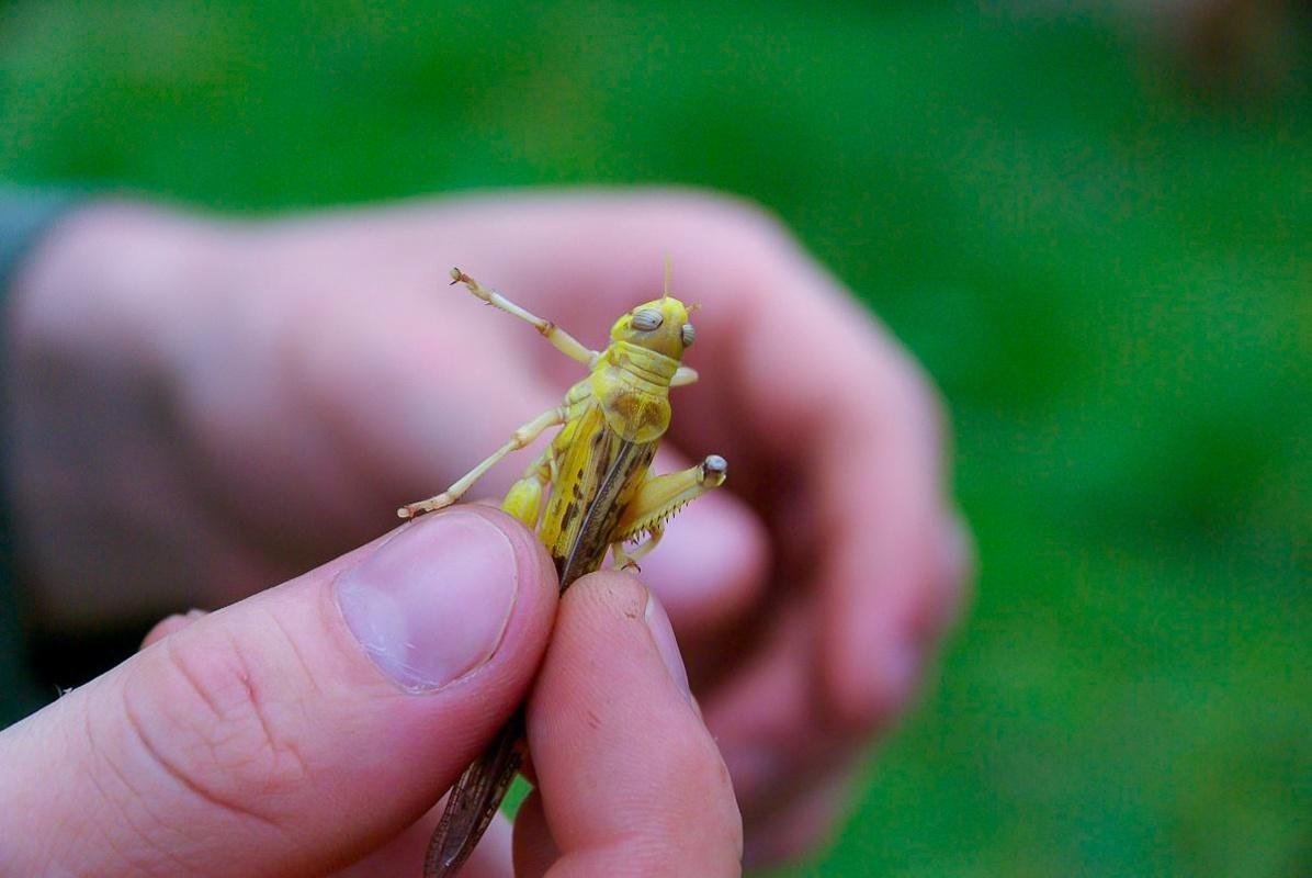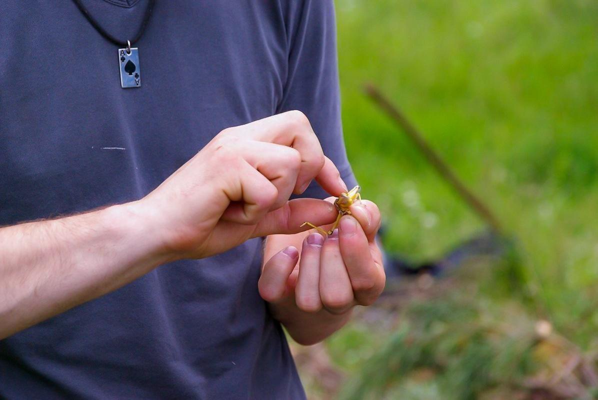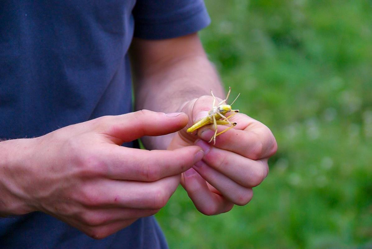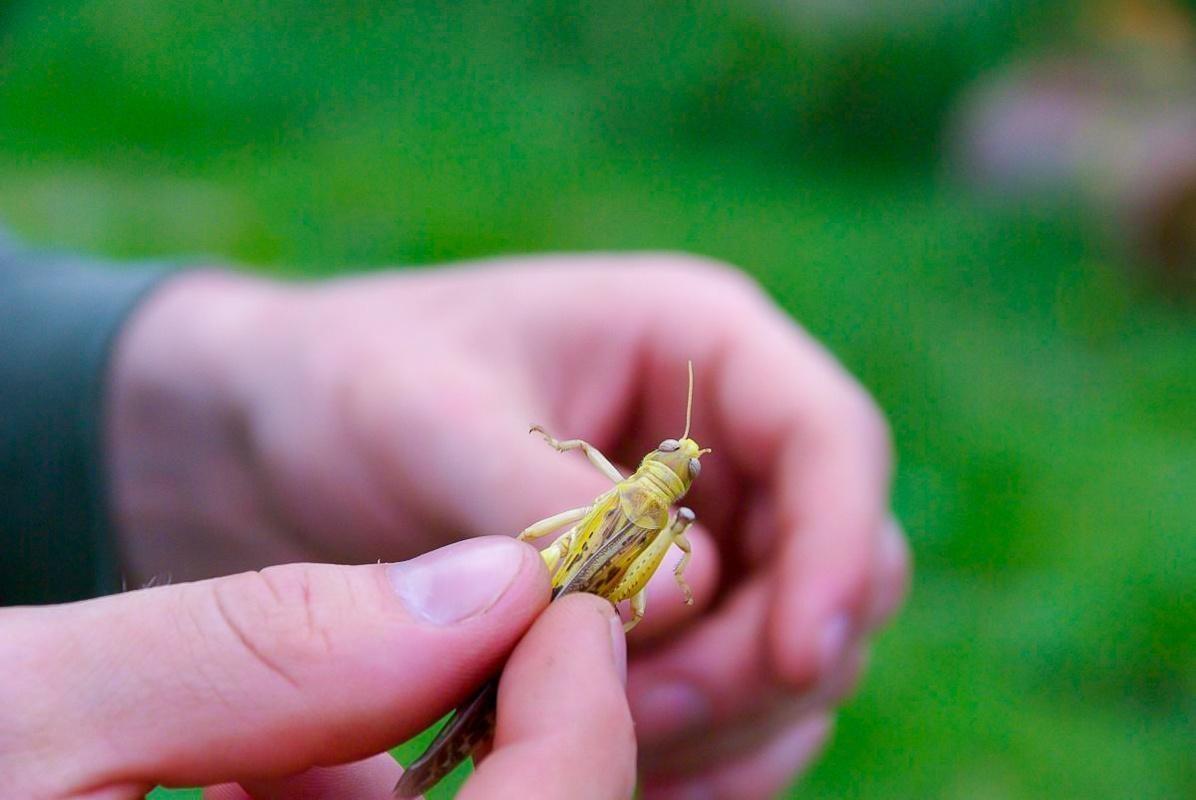 Grashüpfer wird zwischen Daumen und Zeigefinger gehalten