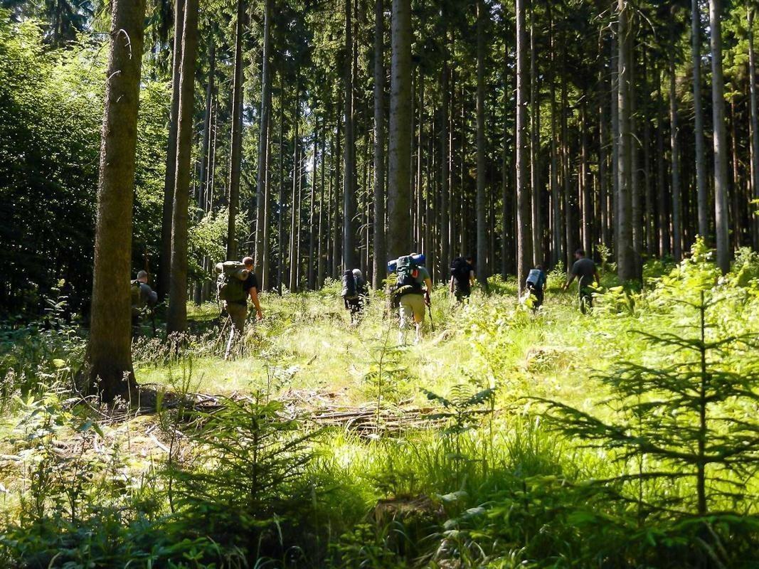 Gruppe mit Rucksäcken bewegt sich durch einen Wald mit hohen Bäumen