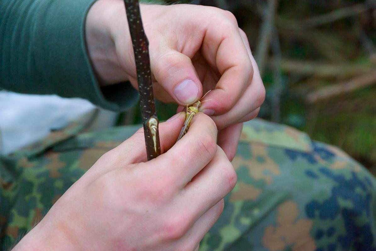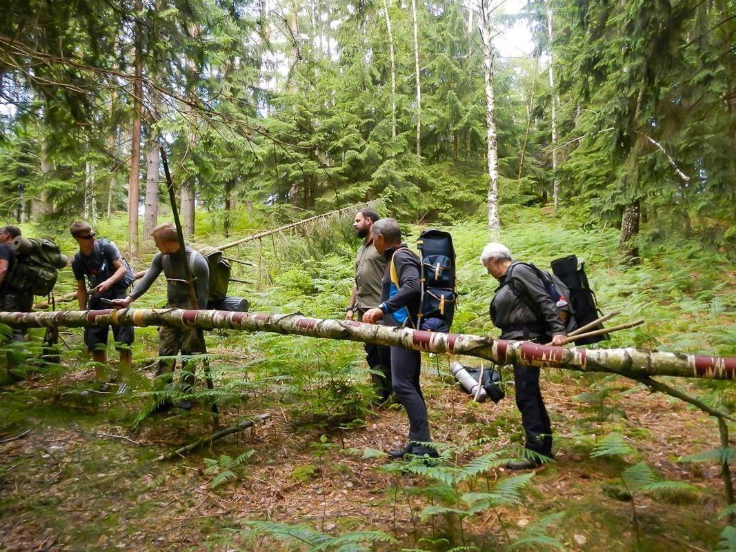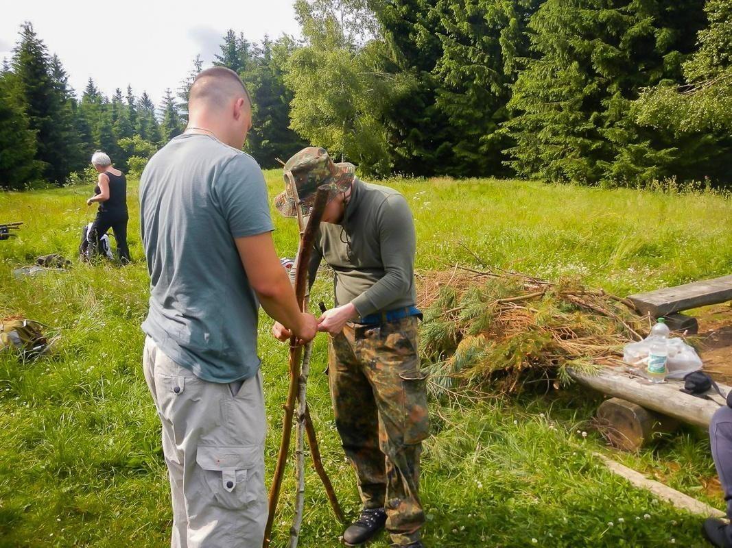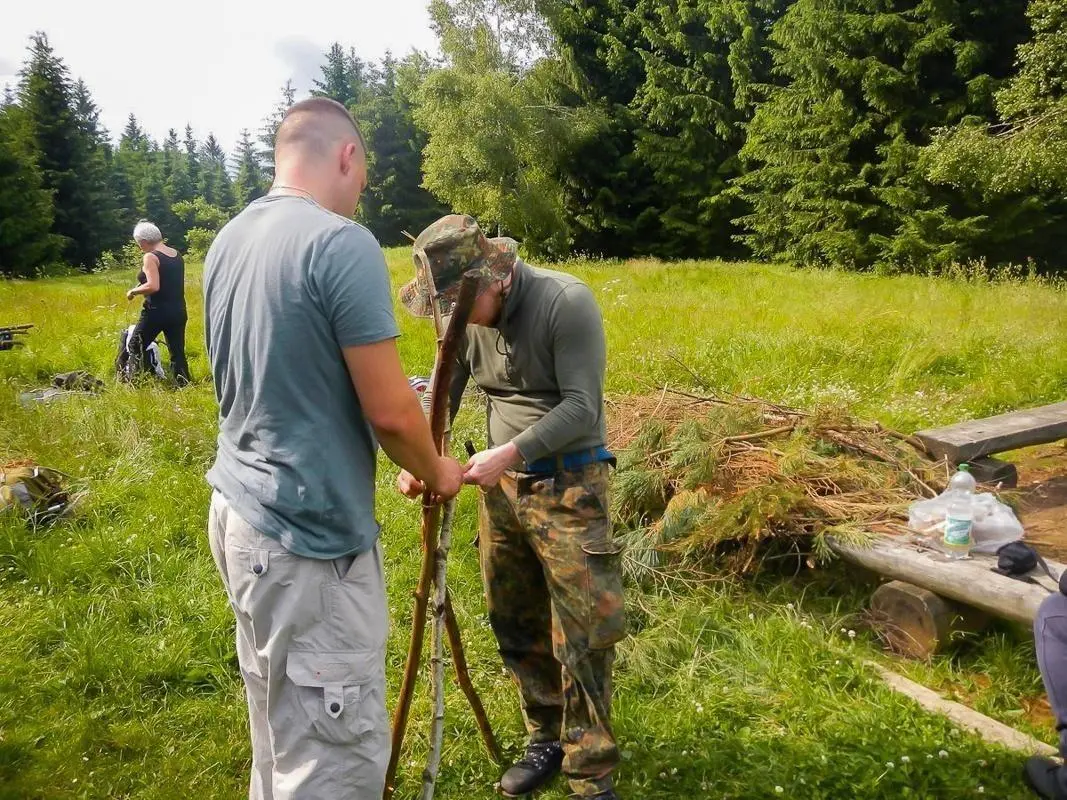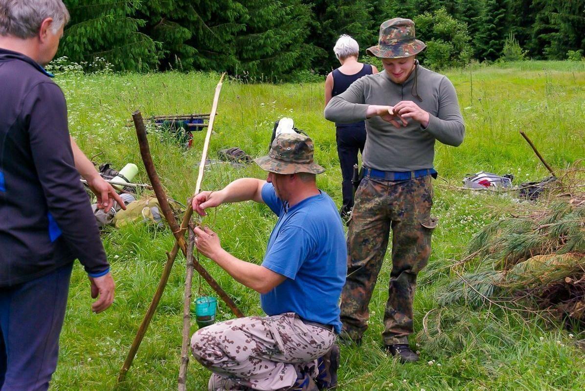 Ein wesentlicher Bestandteil des Kurses war das Erlernen von Knoten- und Schnurtechniken, die für verschiedene Anwendungen im Outdoor-Bereich unerlässlich sind. Die Teilnehmer übten zudem das Bergen und Tragen von Verletzten, was in Notsituationen von großer Bedeutung ist. Im Rahmen der praktischen Übungen wurde auch das Fallenbauen behandelt, wobei Techniken wie die Schlagfalle und Schlinge demonstriert wurden. Diese Fähigkeiten sind entscheidend, um in der Wildnis Nahrung zu sichern.