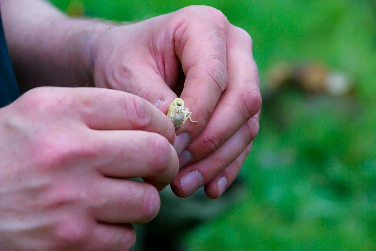 Hände halten eine Heuschrecke zum näheren Betrachten