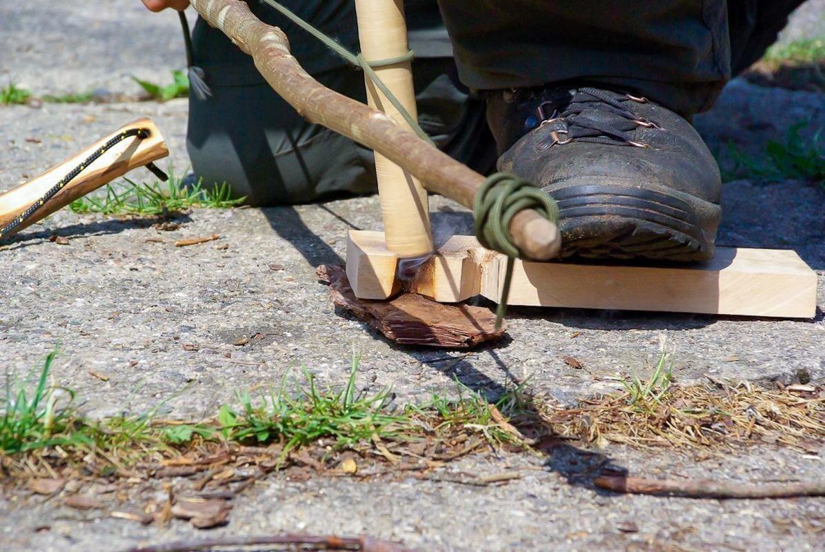Holzstück wird mit einem Stock bearbeitet, um Feuer zu erzeugen