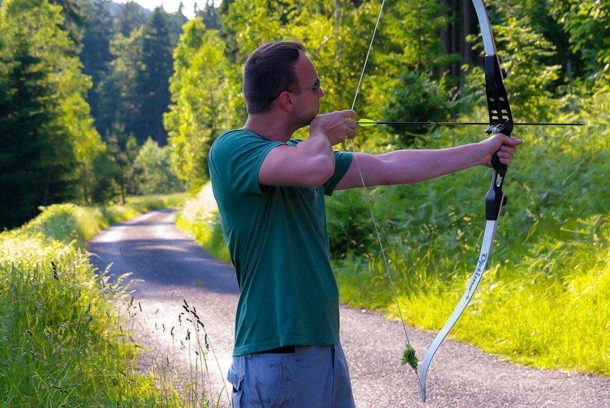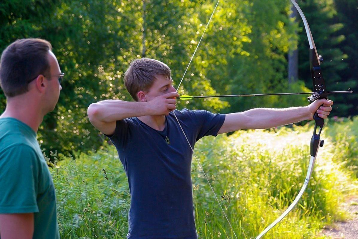 Bogen wird gespannt, Pfeil zielt auf ein Ziel im Grünen