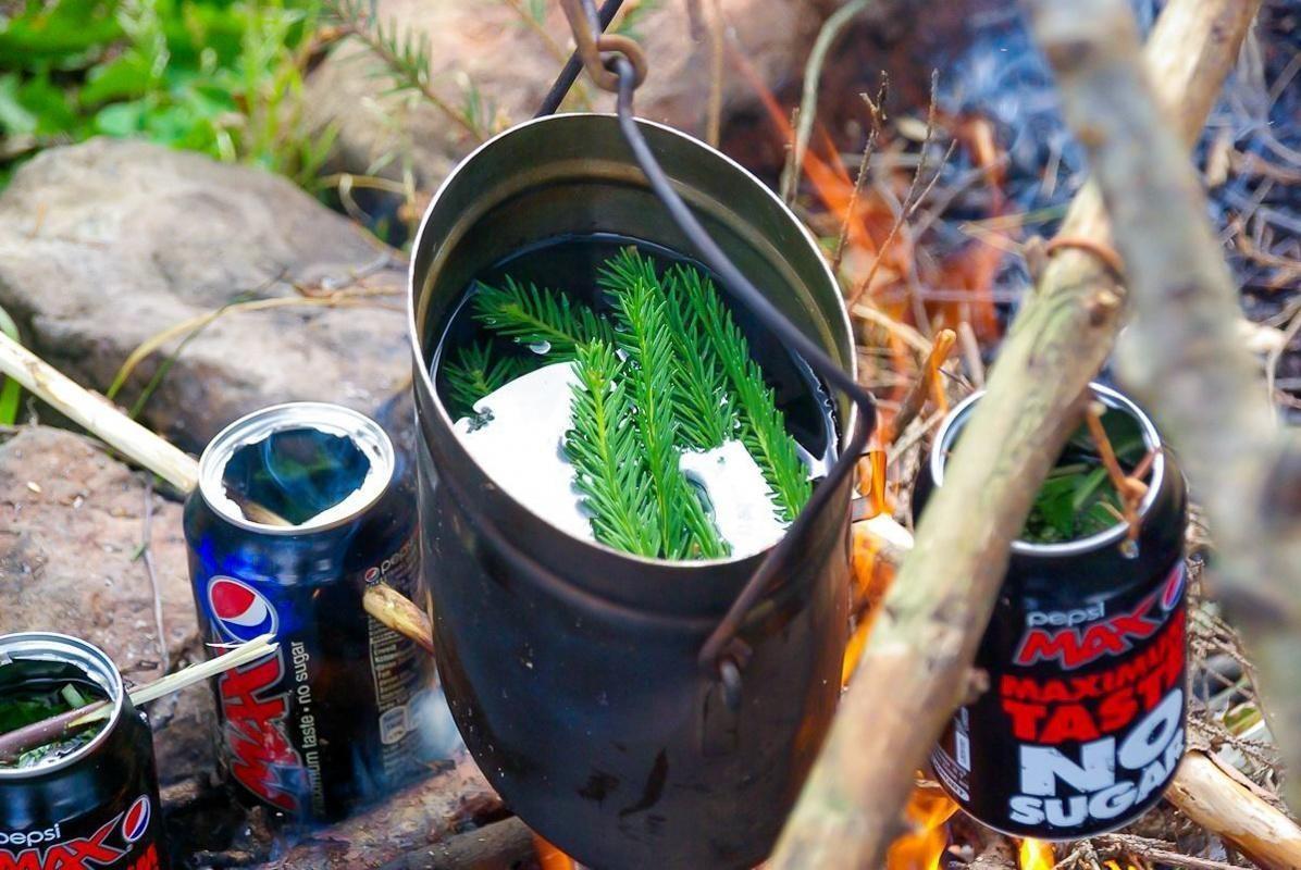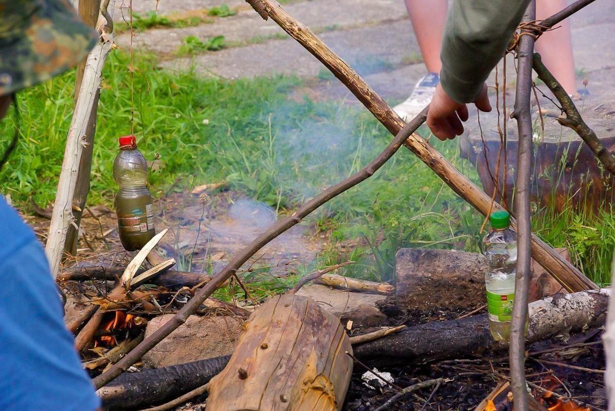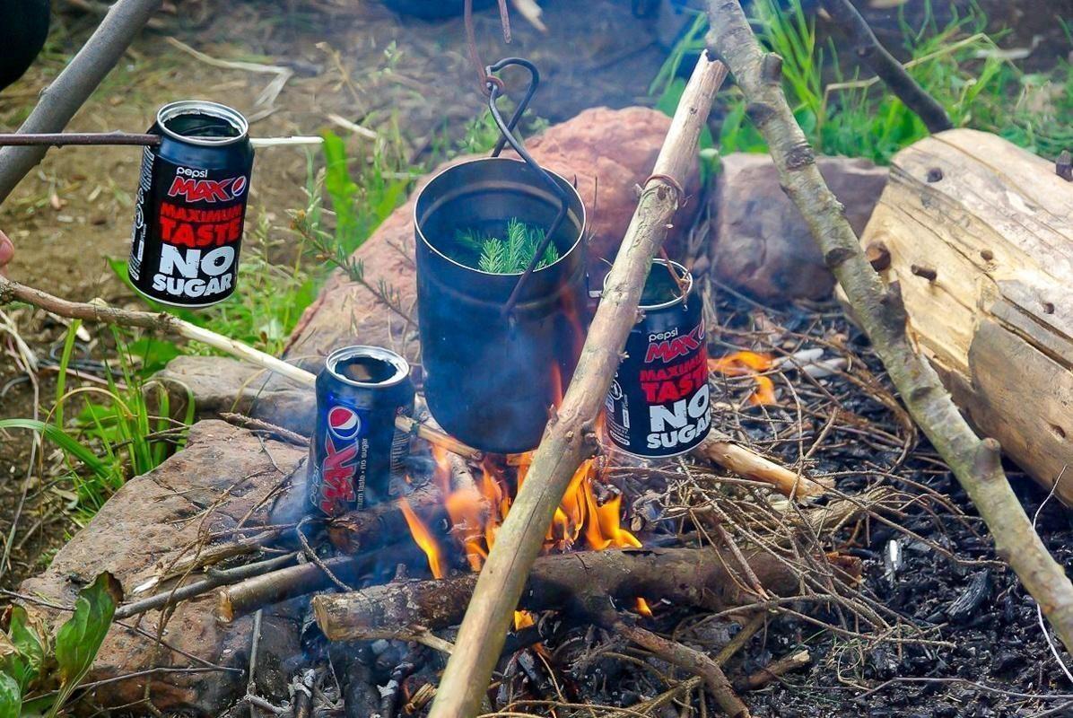 Kessel hängt über Feuerstelle mit Zweigen und Dosen daneben