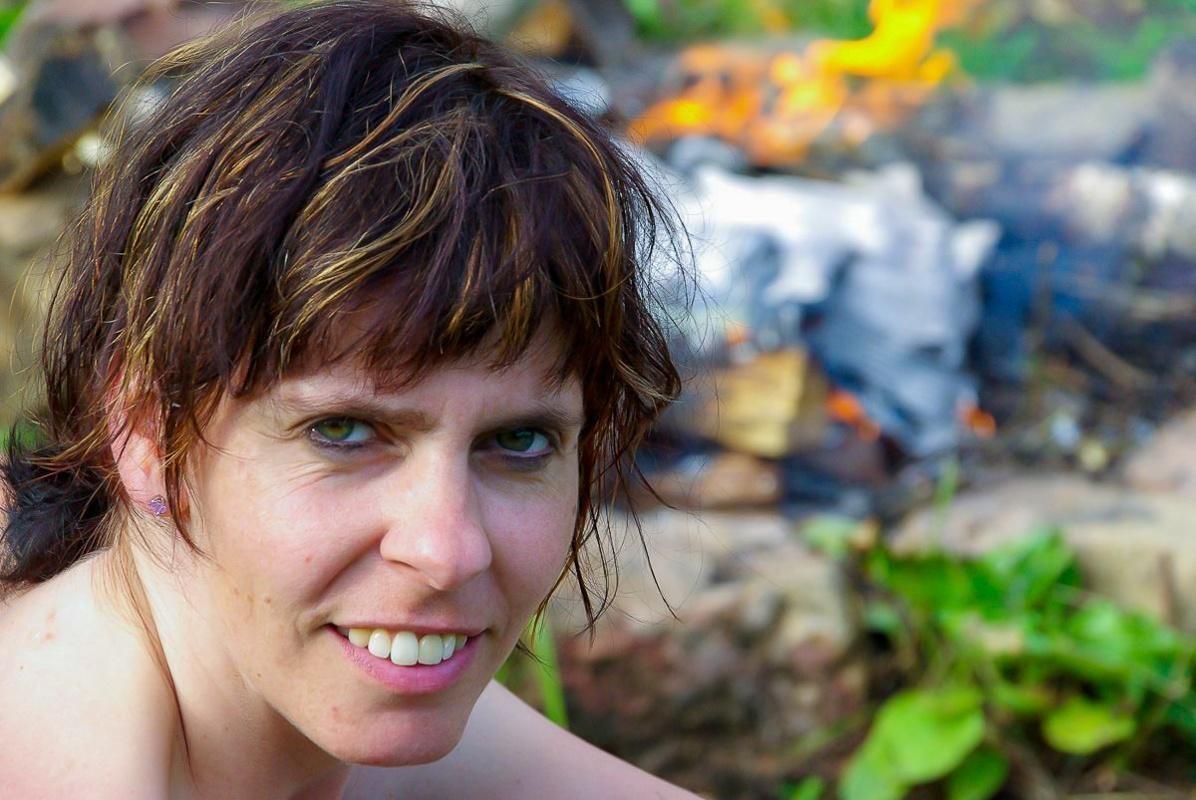 Kleine Flamme raucht zwischen Holzstücken, Teilnehmer sitzen im Kreis darum