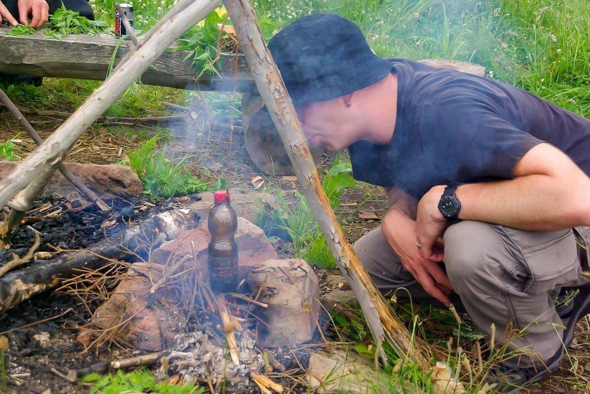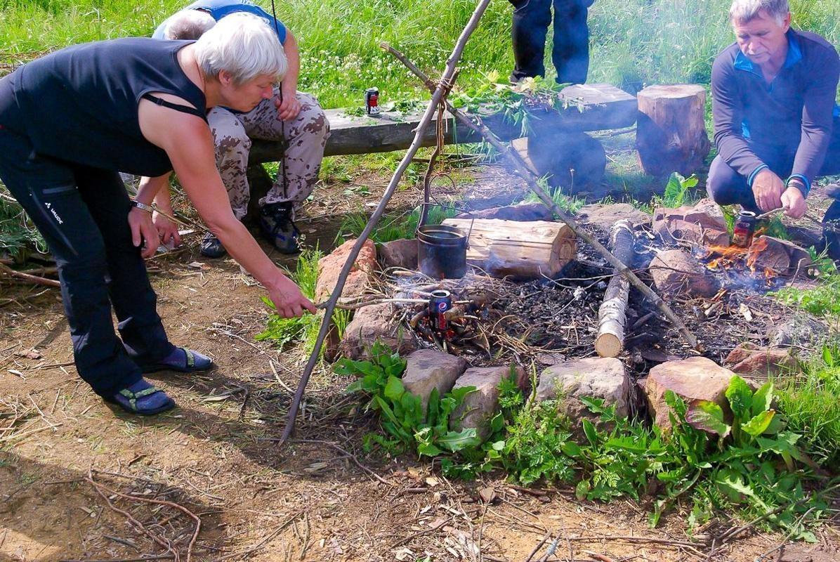 Kessel mit Wasser und Zweigen über Feuerstelle erhitzt