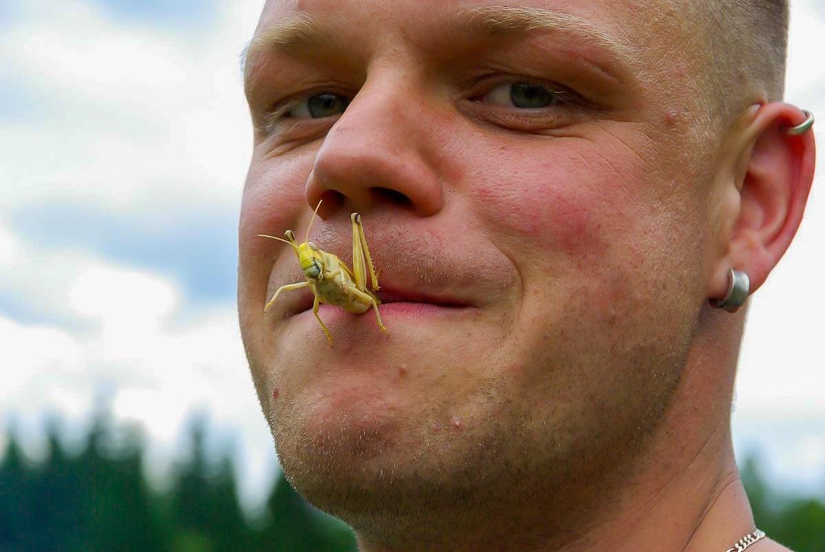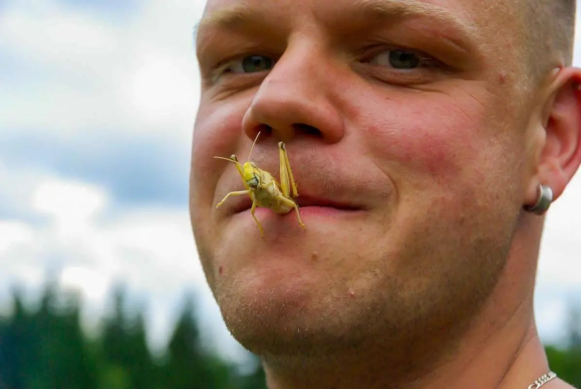 Mann mit Heuschrecke auf der Lippe lächelt in die Kamera