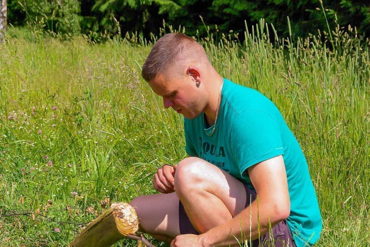 Mann sitzt im Gras und bearbeitet Holzstücke mit einem Messer