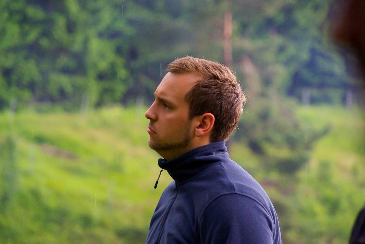 Mann mit dunklem Pullover steht in der Natur und schaut nach oben