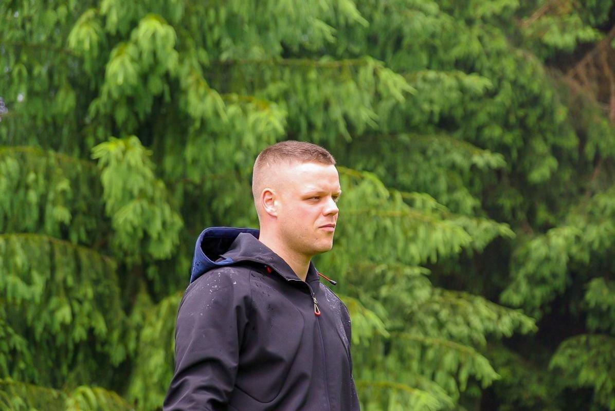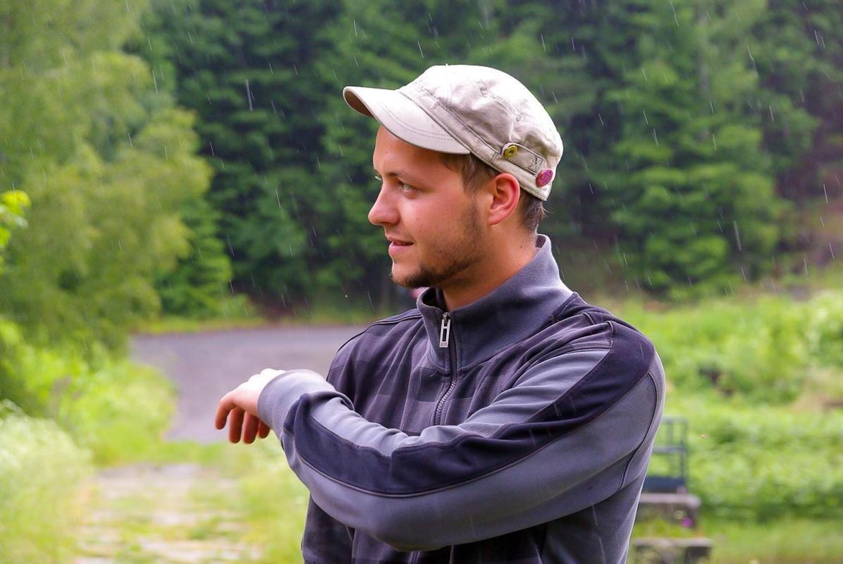 Mann mit Kappe und Jacke steht im Freien, umgeben von Bäumen