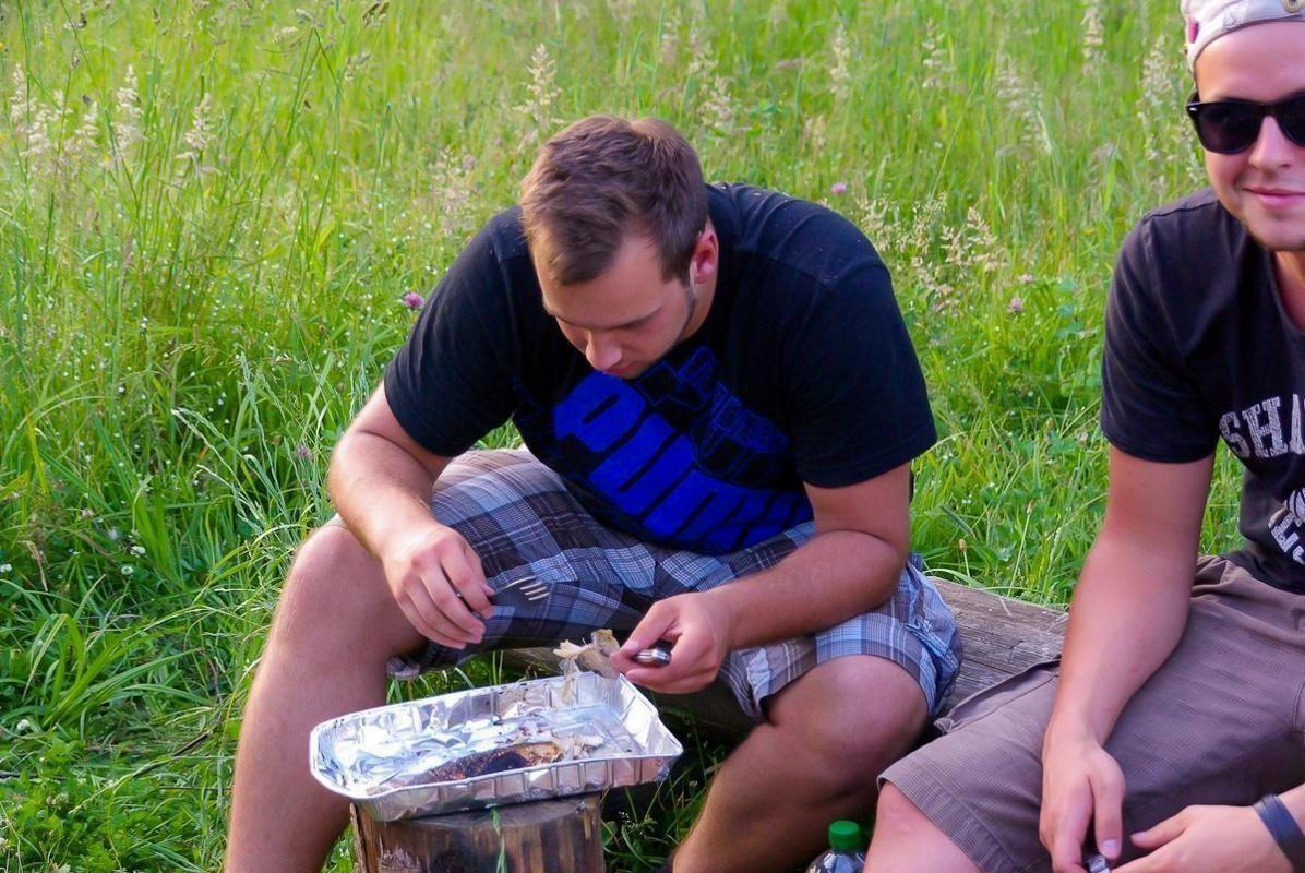 Mann sitzt auf Holzscheit und isst aus Aluschale, daneben steht Getränk