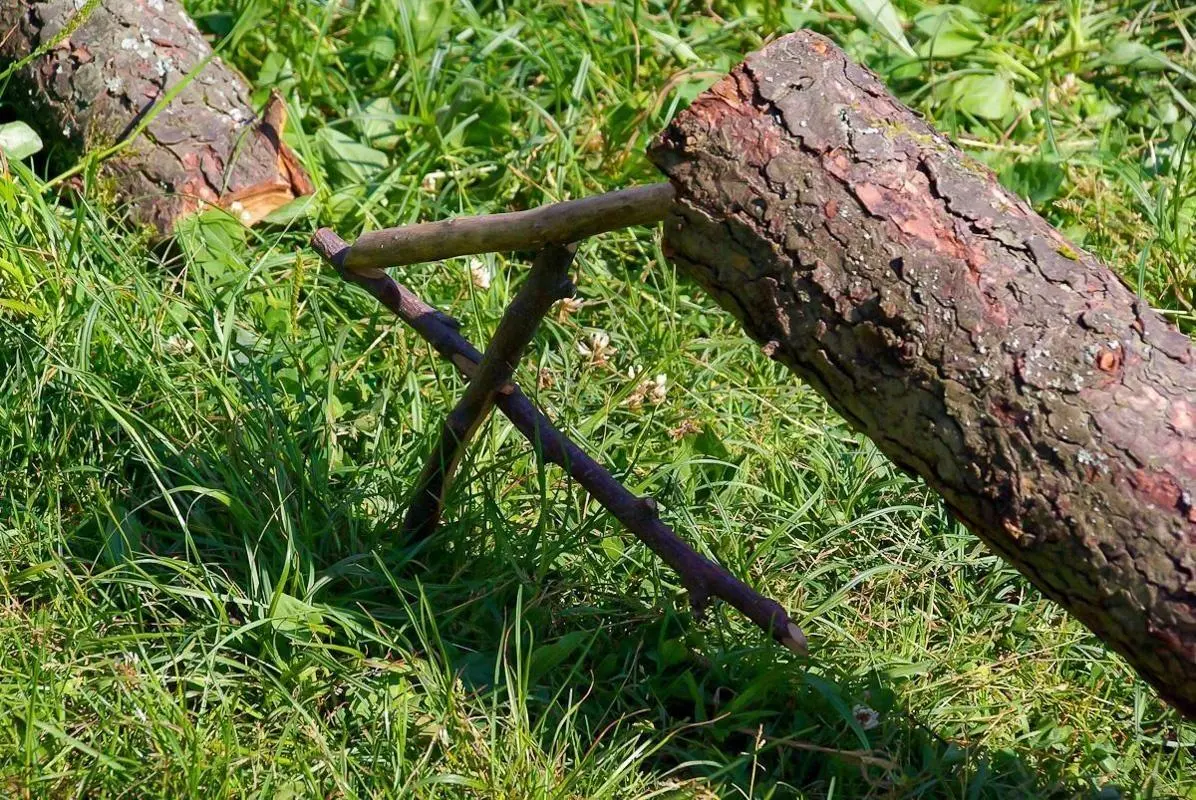 Schlagfalle (Figure-Four/4er-Falle) aus Holzstücken im Gras