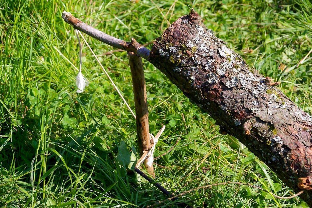 Schlagfalle (Figure-Four) mit Holzstück und Auslöser in Graslandschaft