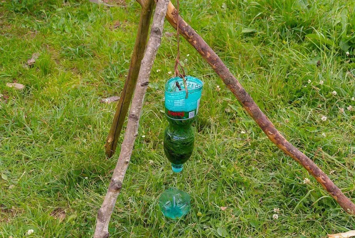 Selbstgebaute Konstruktion mit zwei Ästen und hängender Wasserflasche