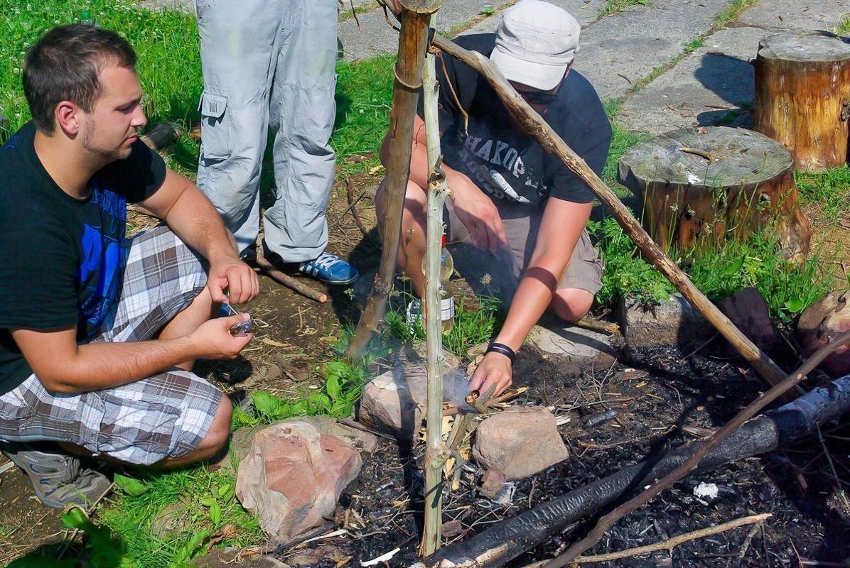 Gruppe sitzt um ein Lagerfeuer und bereitet Zunder vor