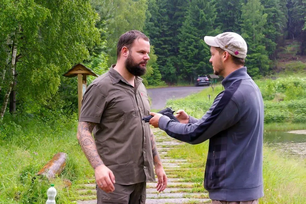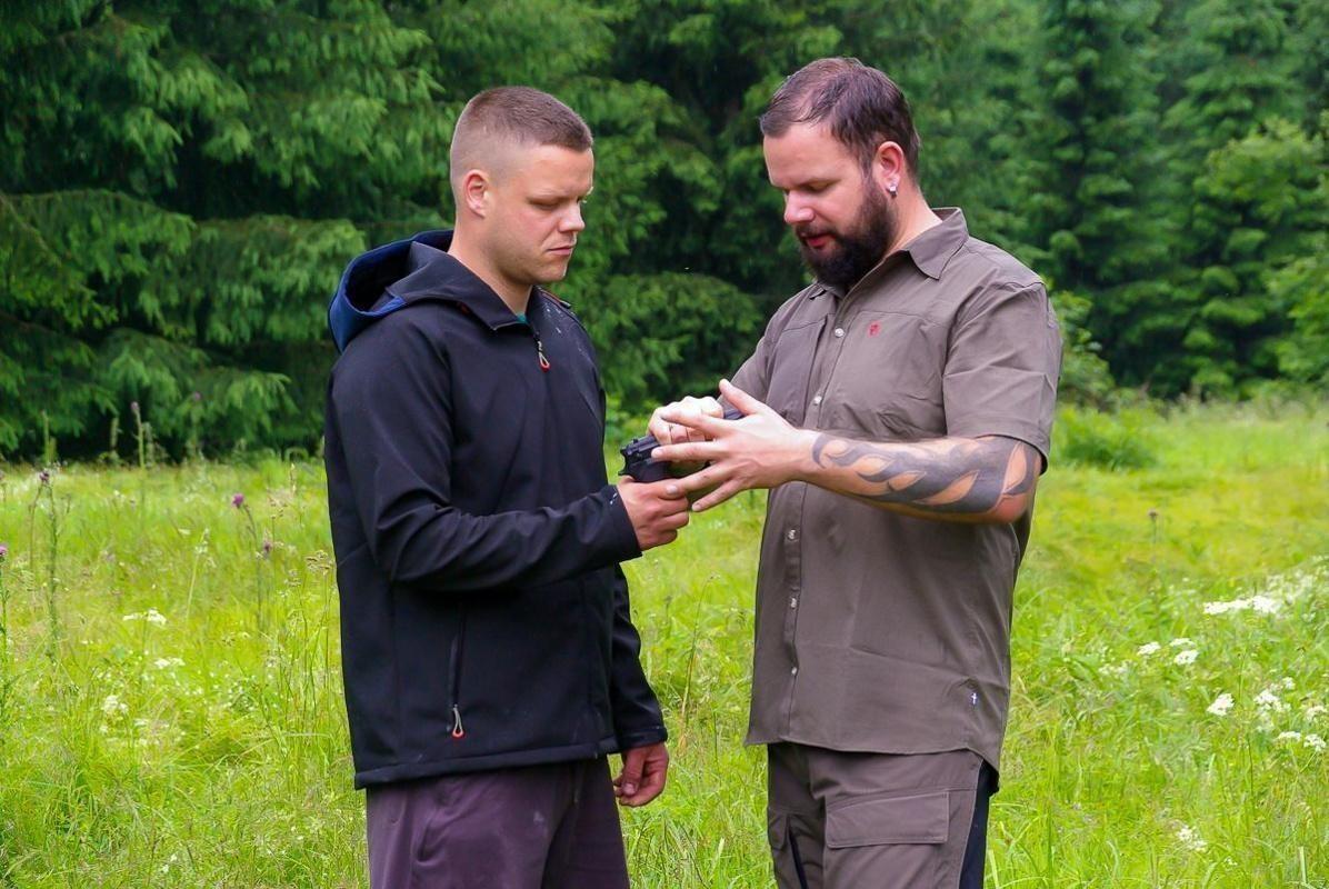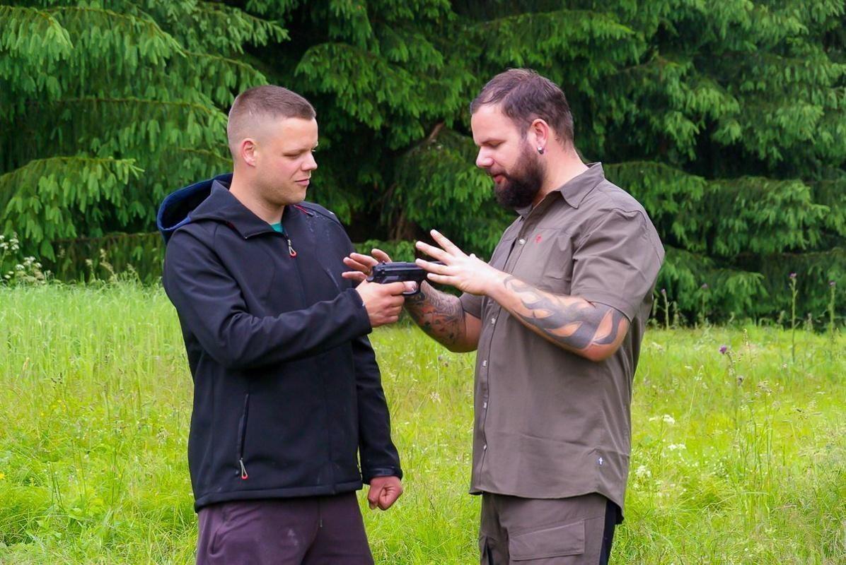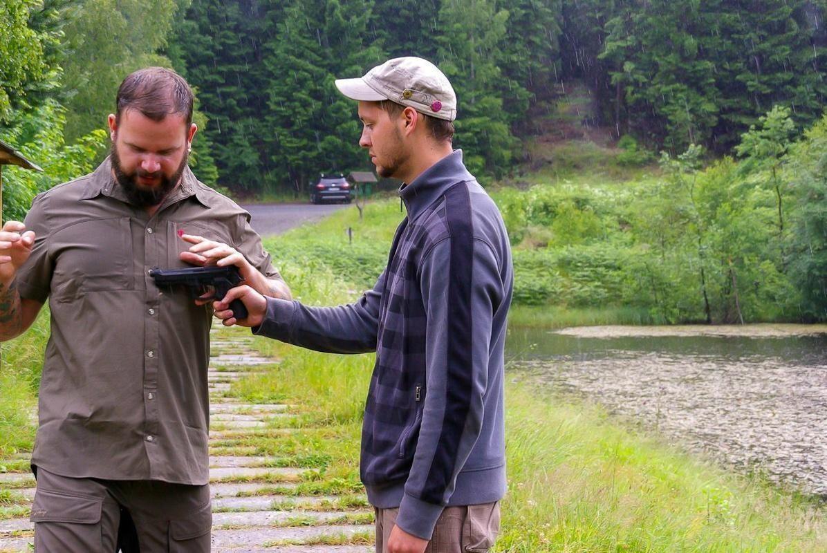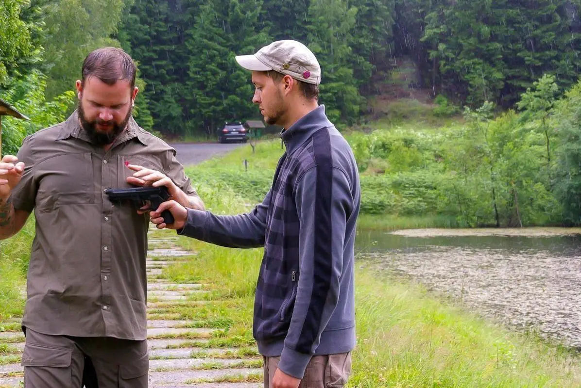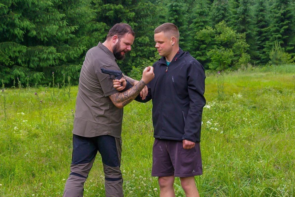 Zwei Personen üben eine Selbstverteidigungstechnik im Freien mit einer Handfeuerwaffe