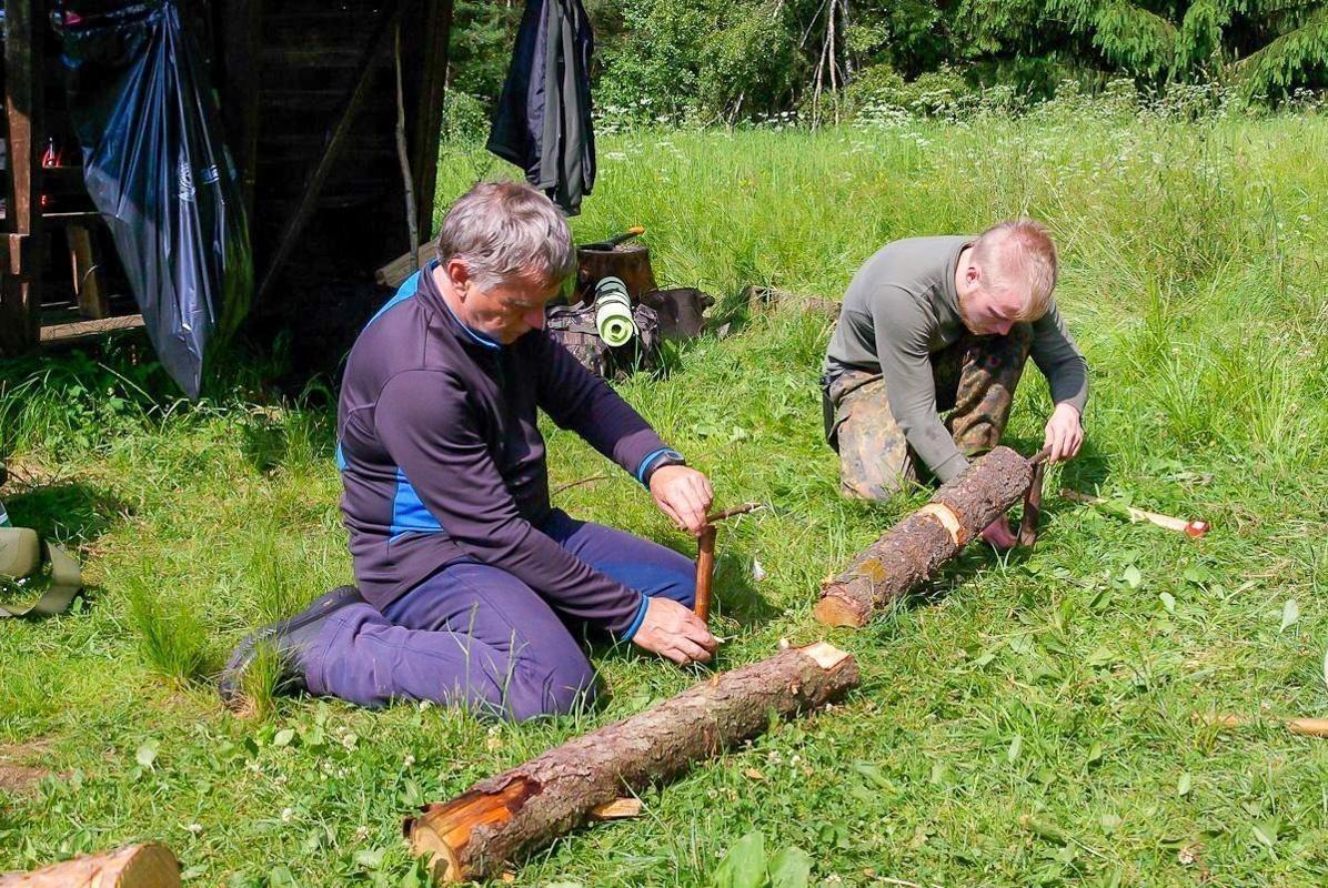 Teilnehmer bearbeiten Holzstücke mit Messern auf Baumstämmen im Freien