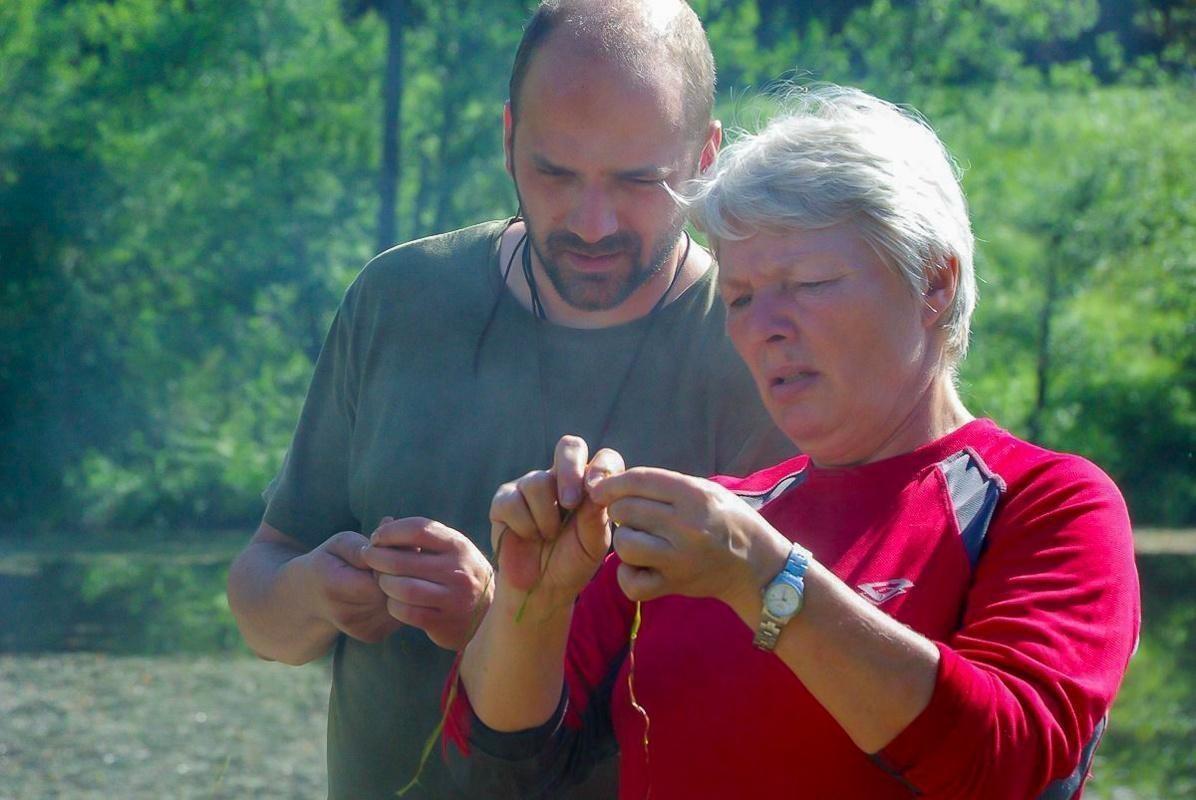 Zwei Personen knoten Schnüre am Ufer eines Gewässers