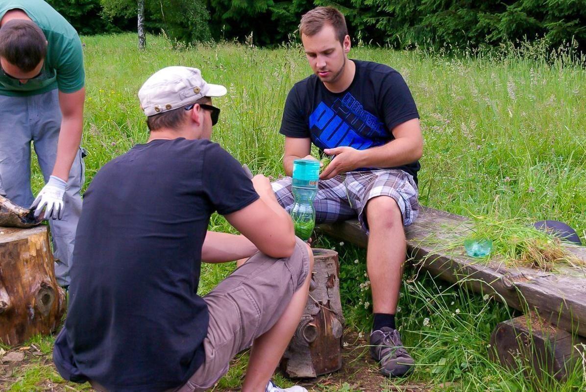 Vier Personen knien um eine selbstgebaute Konstruktion aus Ästen und einem Glas