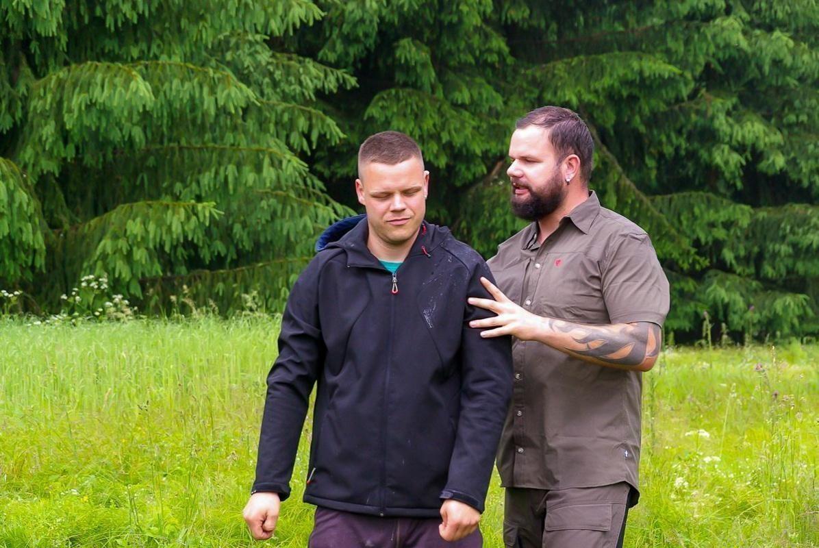 Zwei Männer in einem Wald, einer hält den anderen von hinten fest