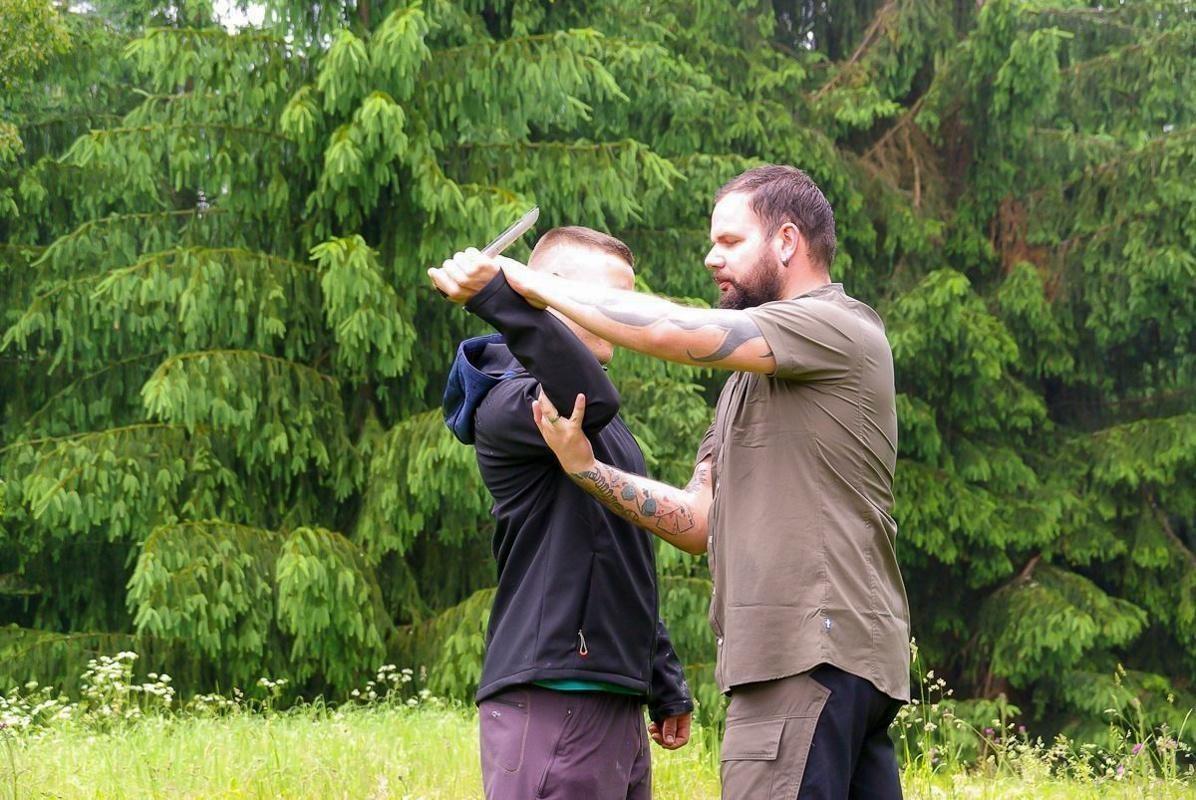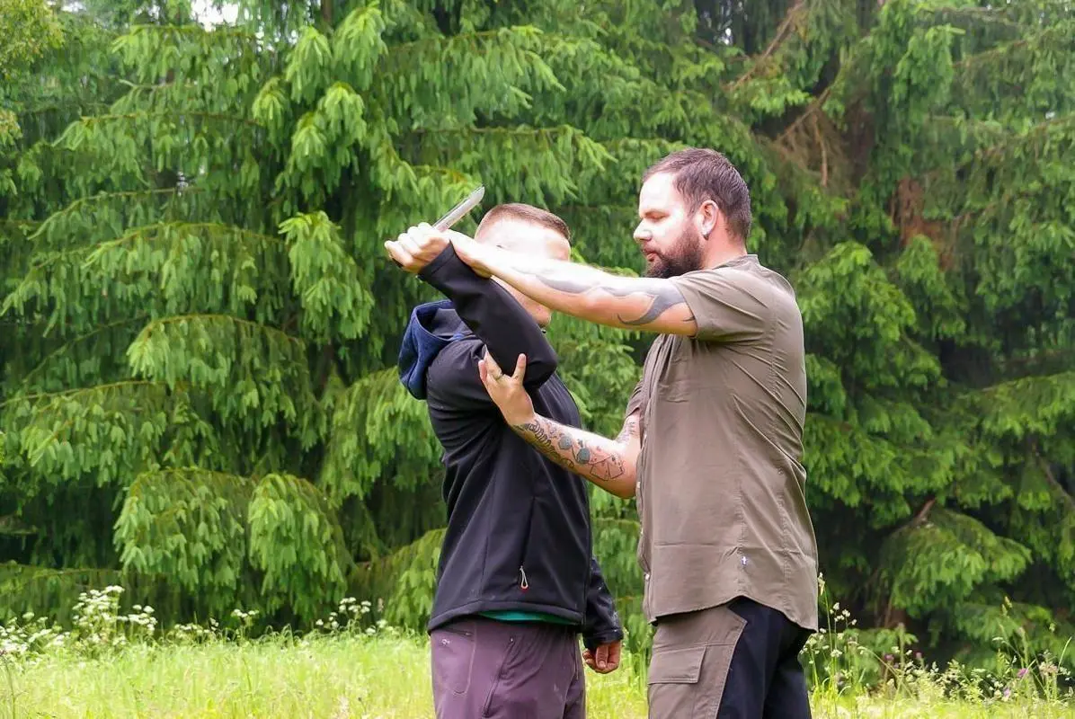 Zwei Personen üben eine Selbstverteidigungstechnik mit einem Messer im Freien