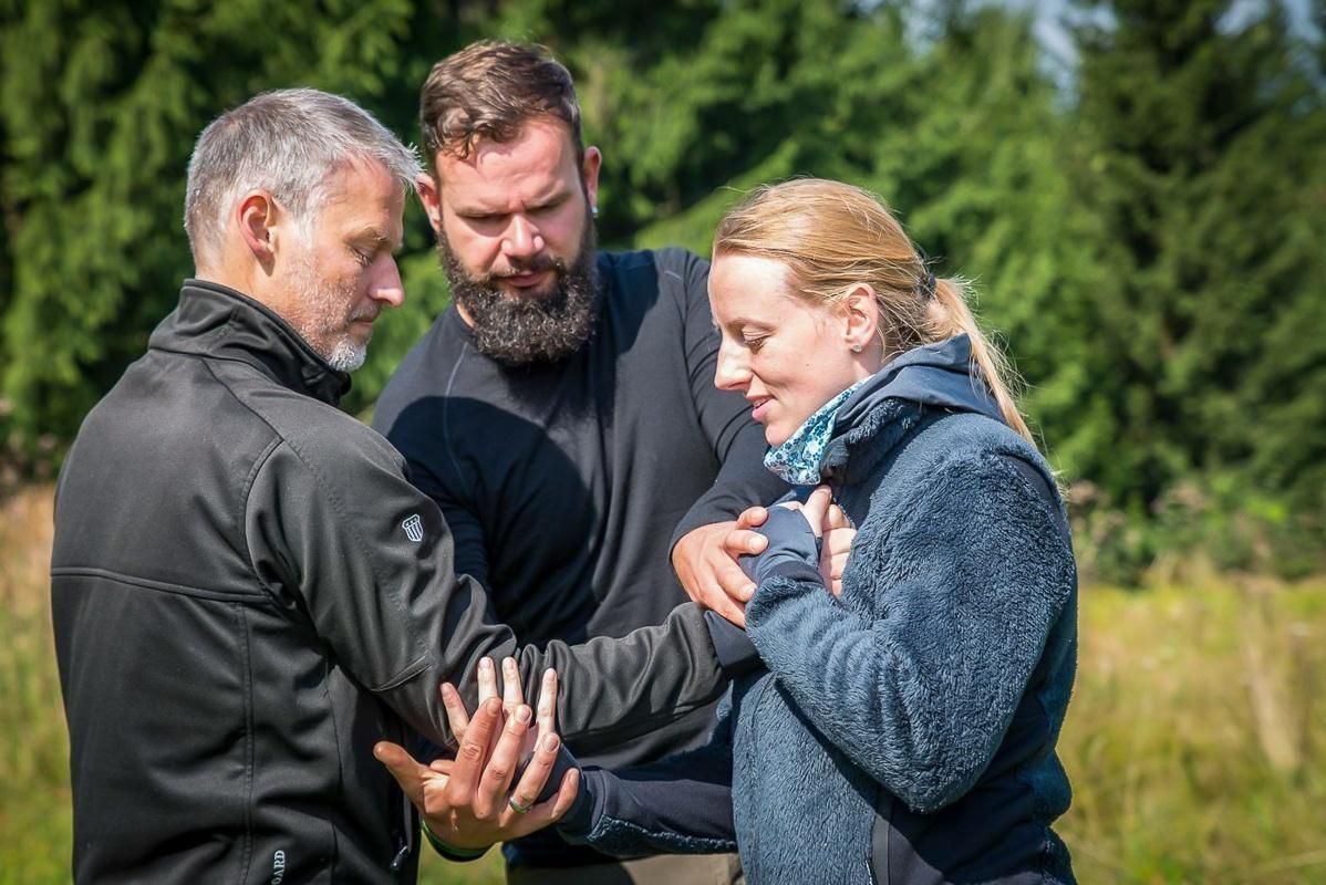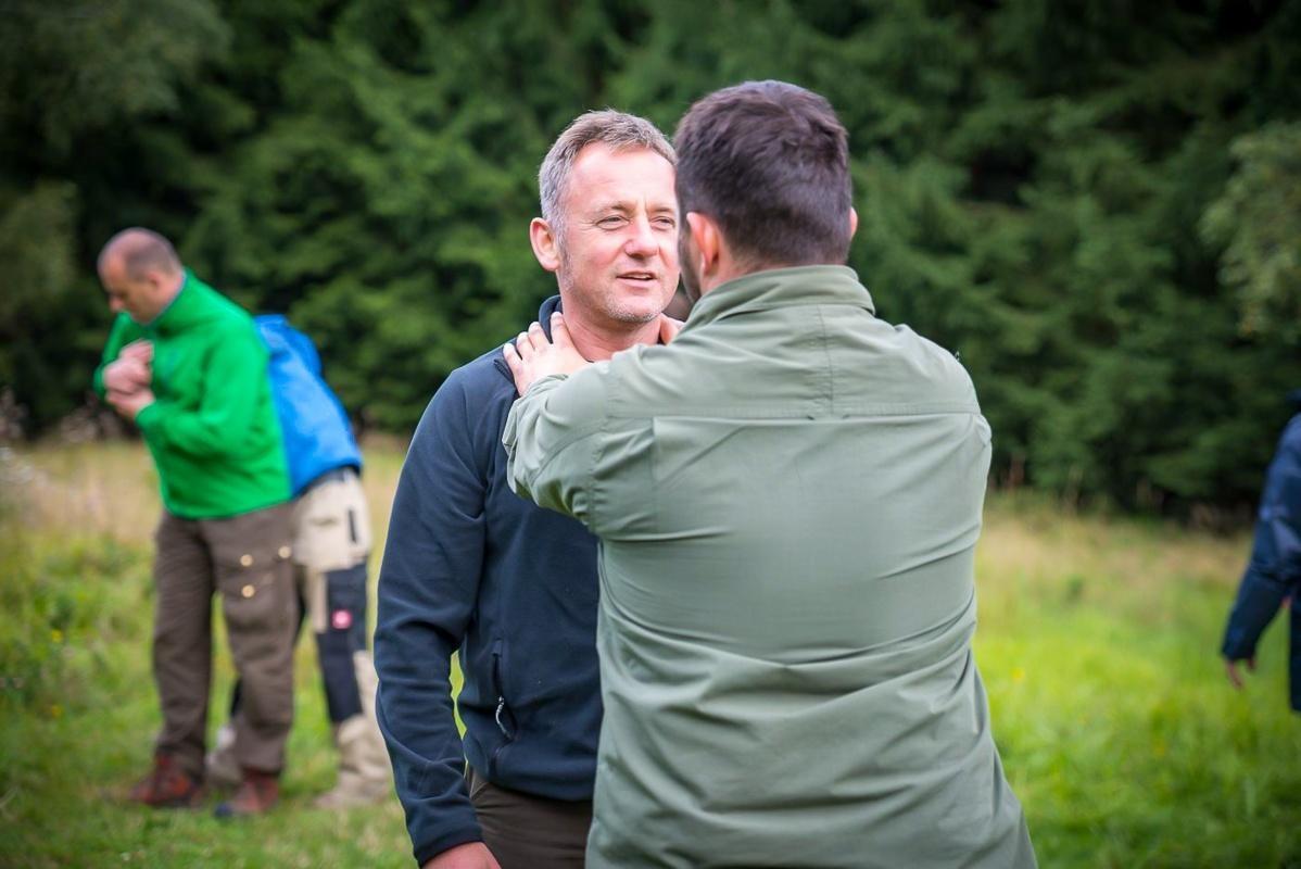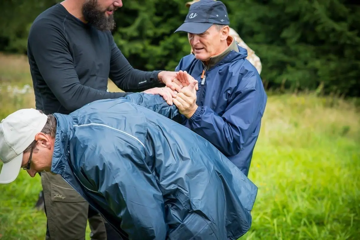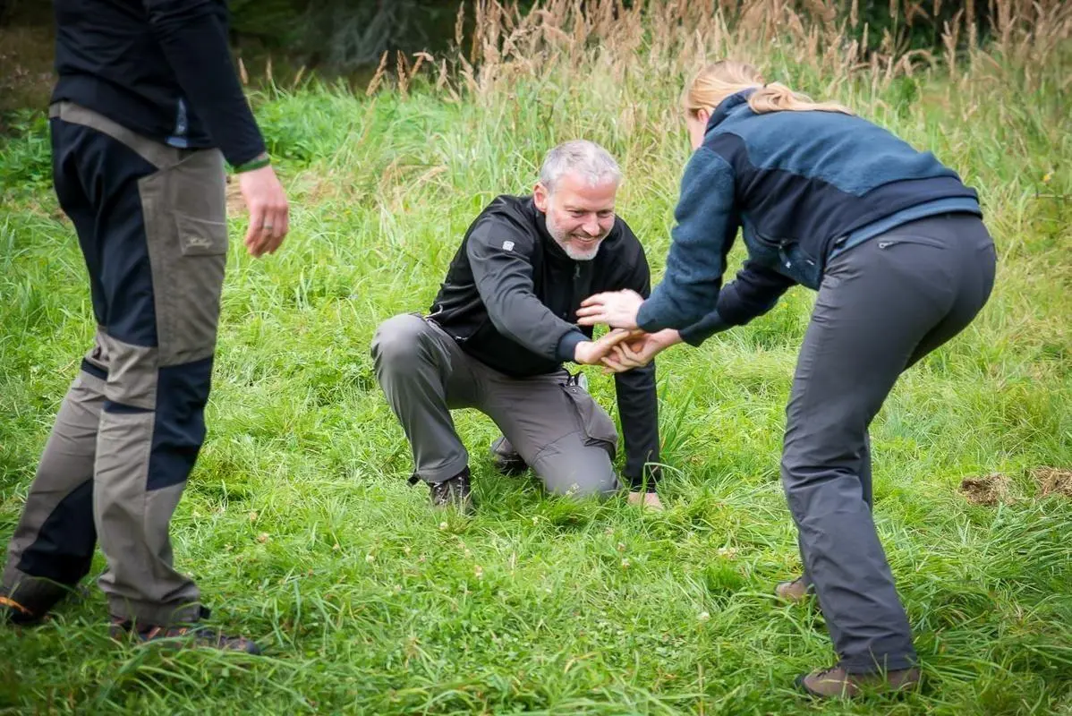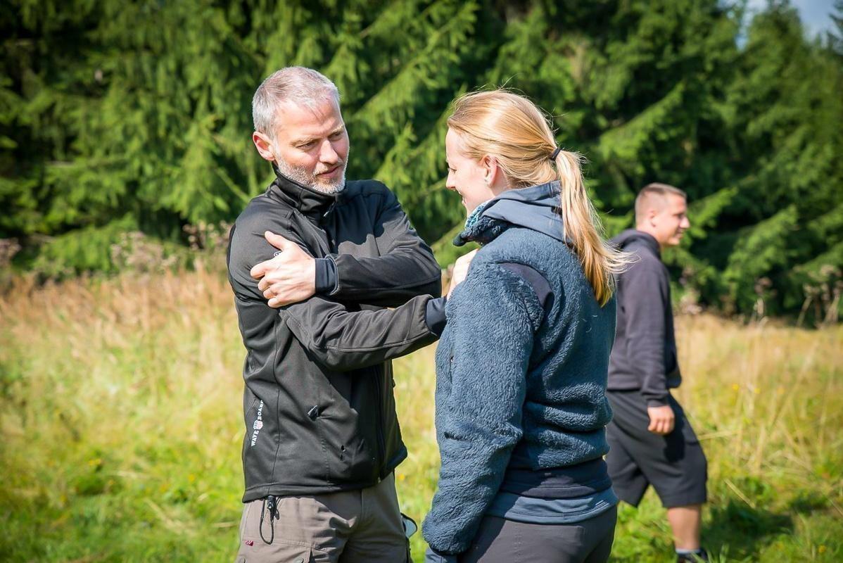 Zwei Personen üben eine Technik zur Unterstützung in einer natürlichen Umgebung