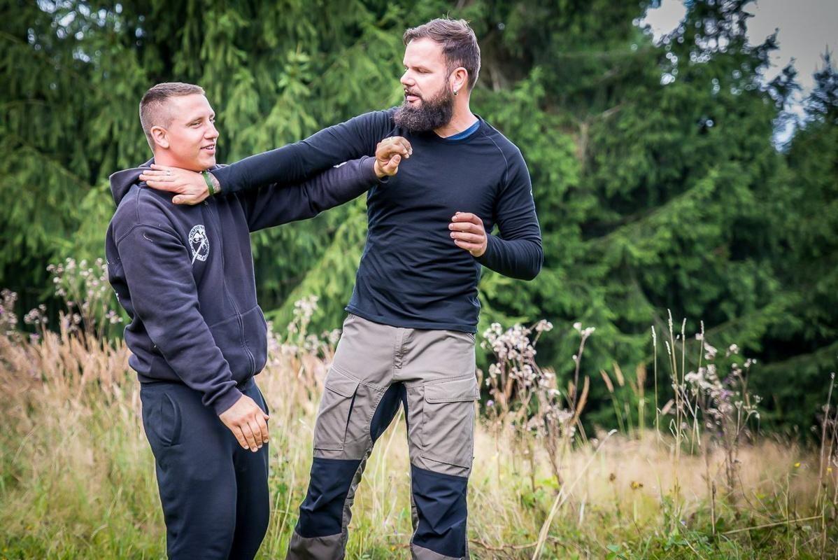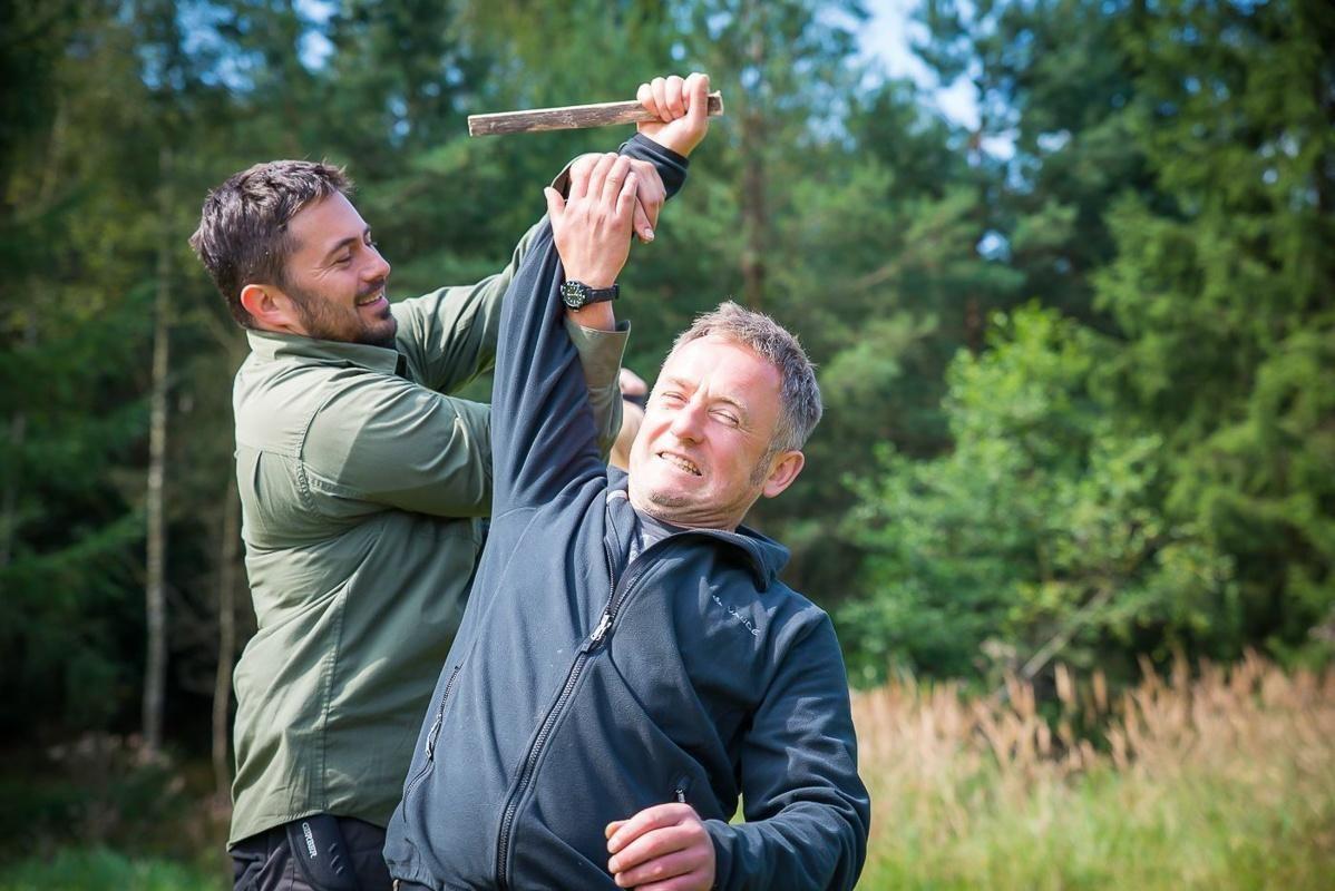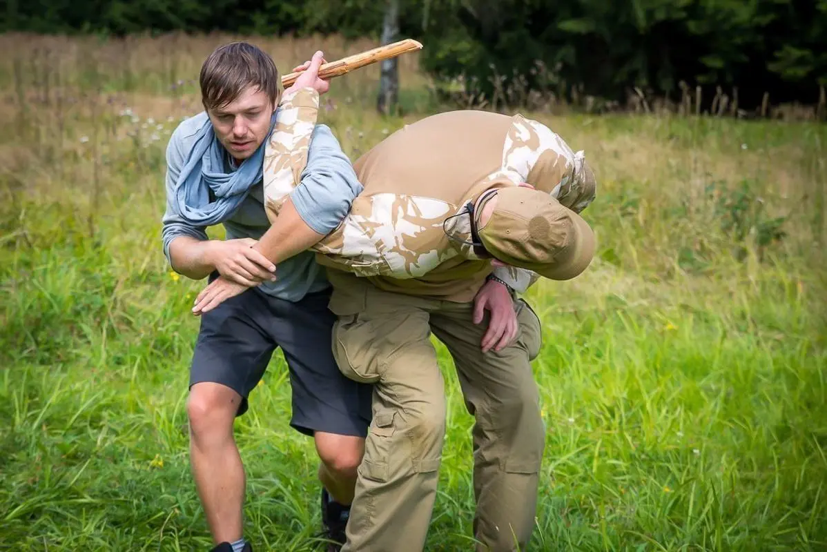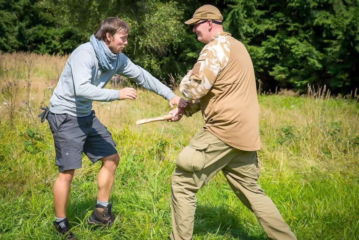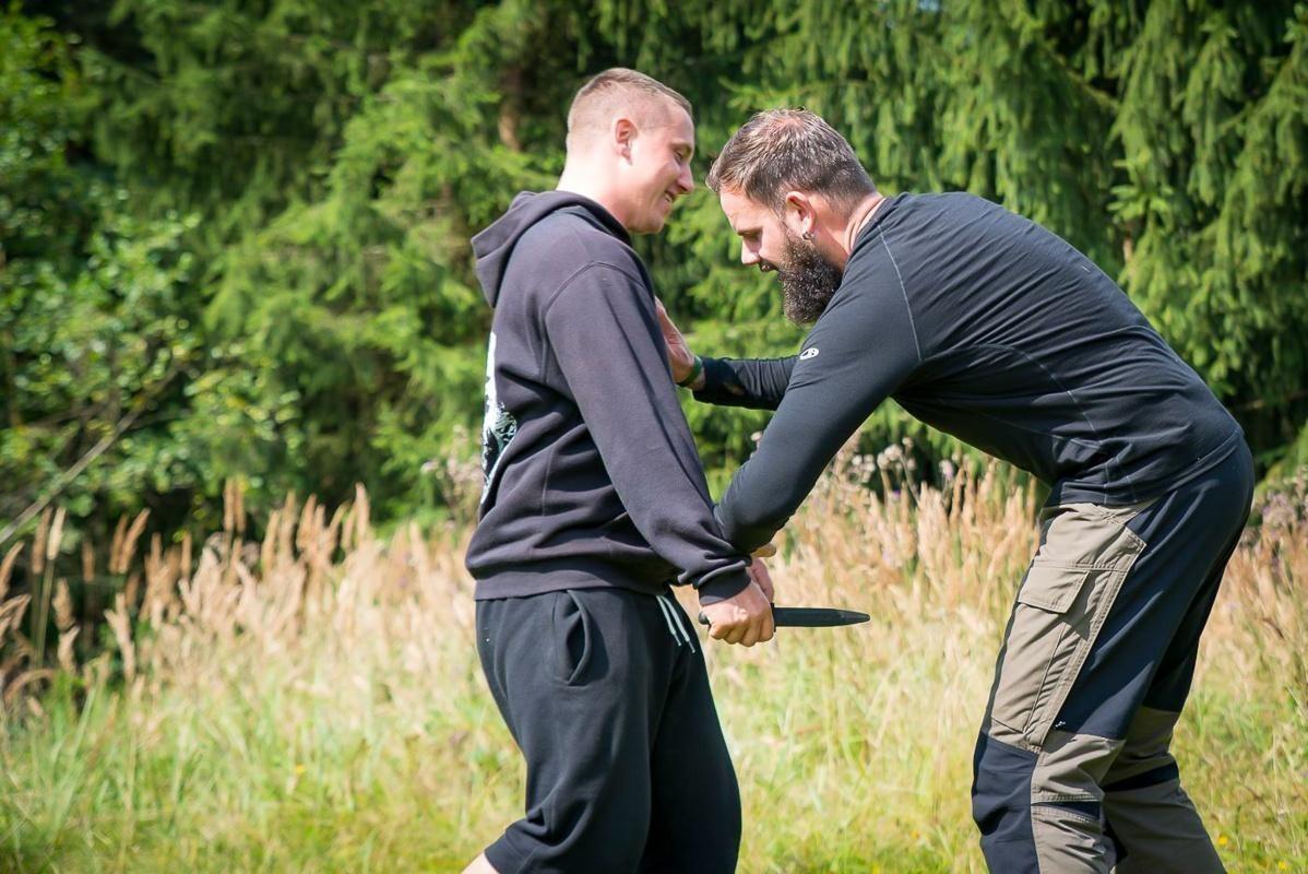 Zwei Personen üben eine Selbstverteidigungstechnik mit einem Messer im Freien