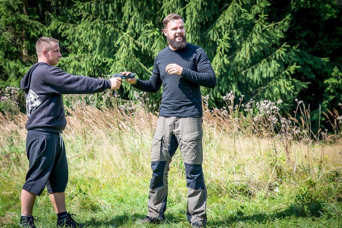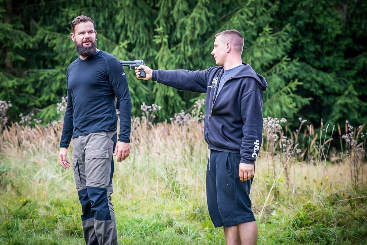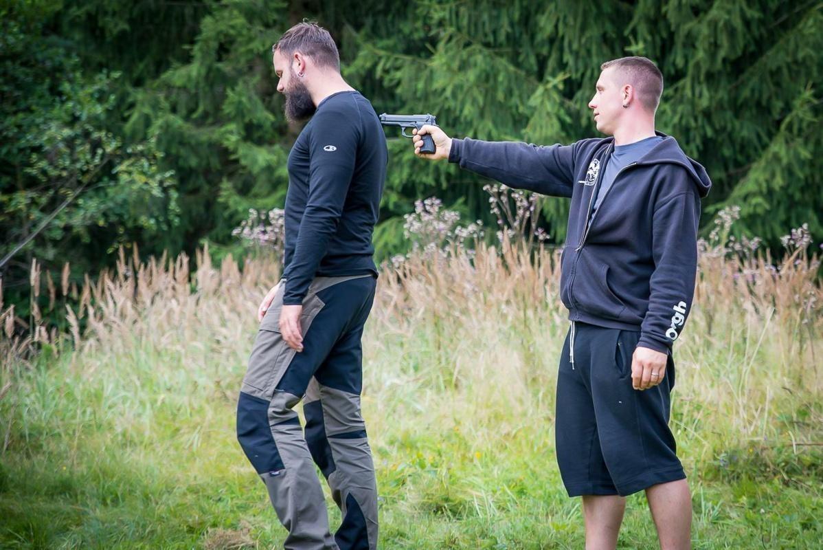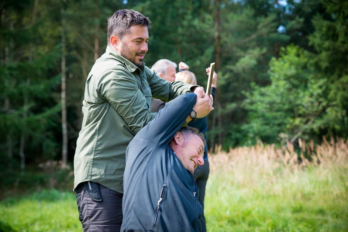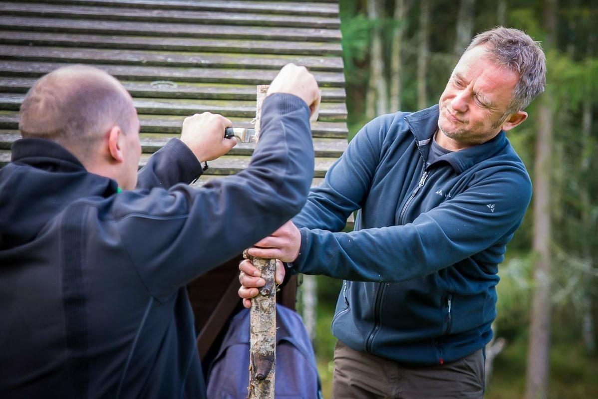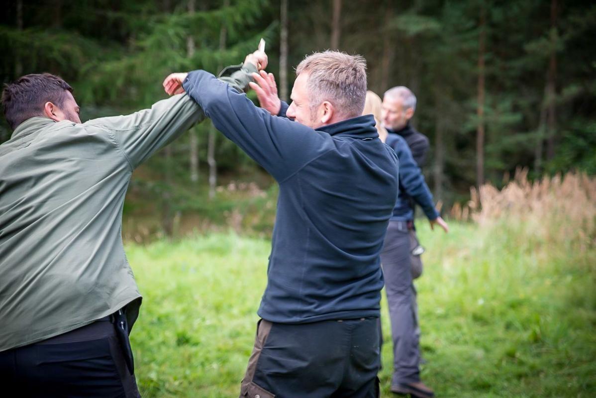 Zwei Personen üben eine Selbstverteidigungstechnik mit einem Messer im Freien