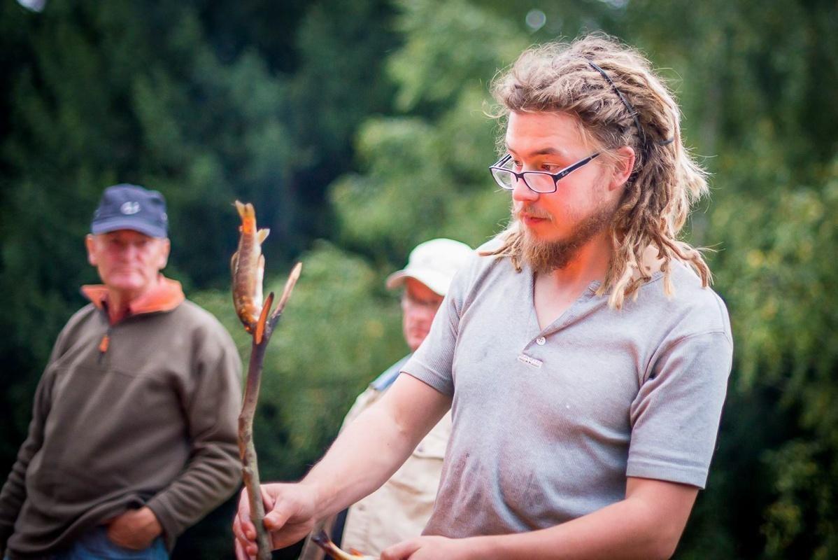 Ein Mann hält einen Stock mit gegrilltem Fisch über einer Feuerstelle