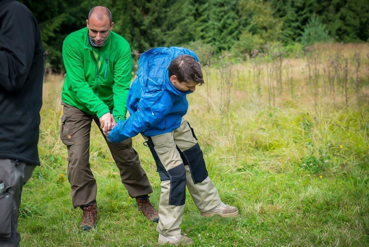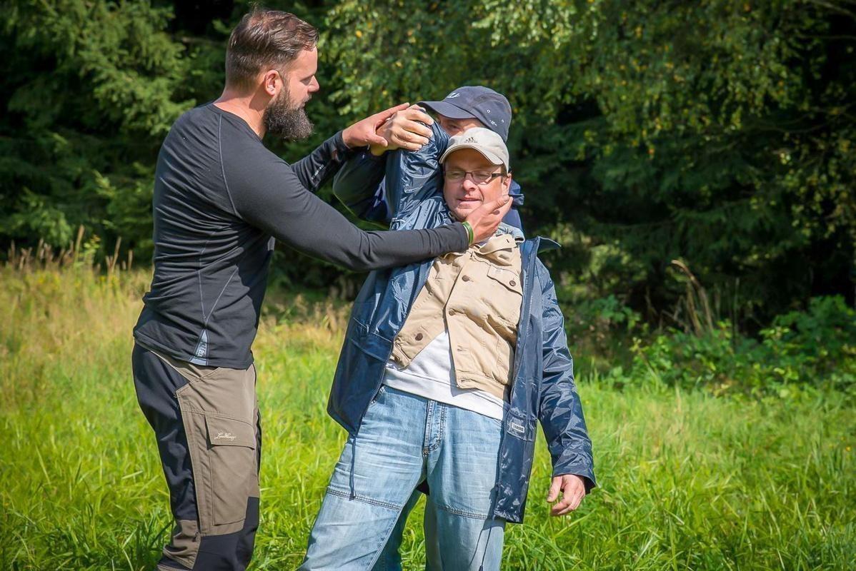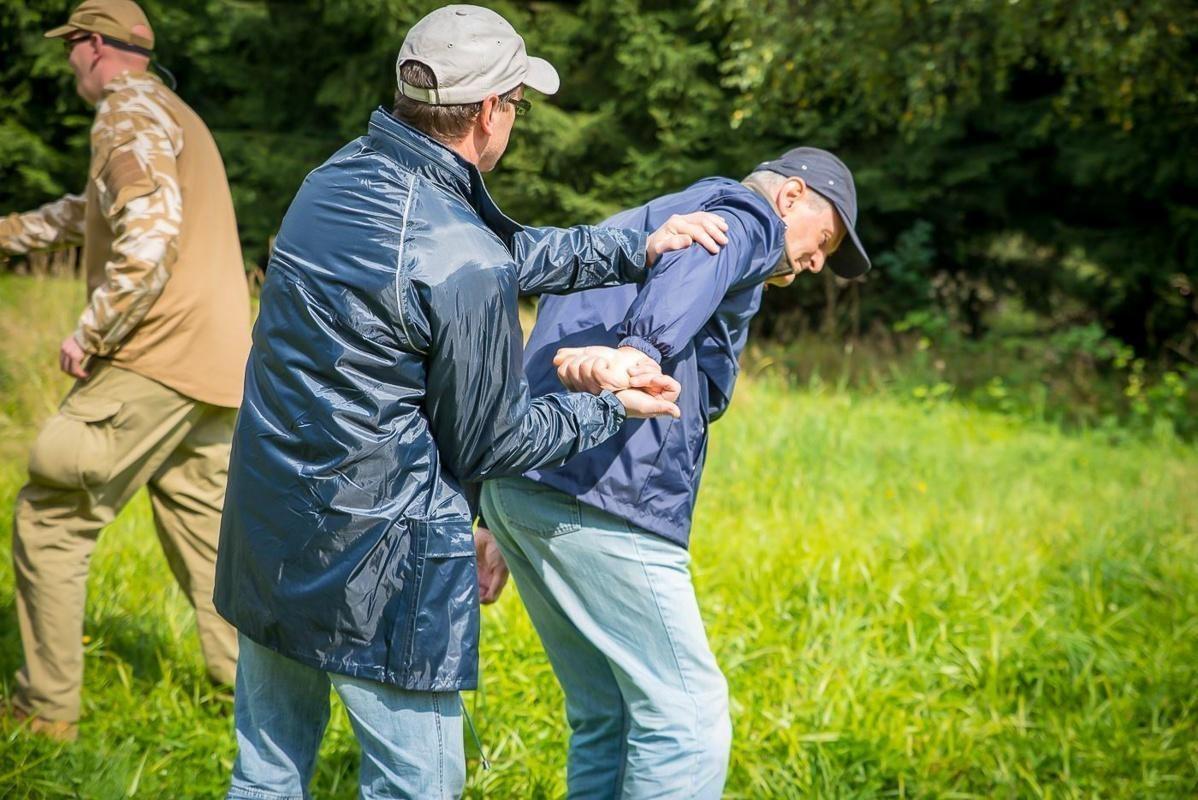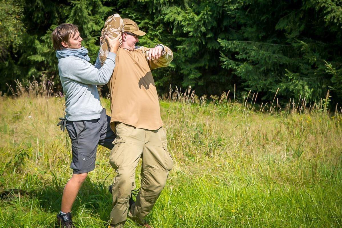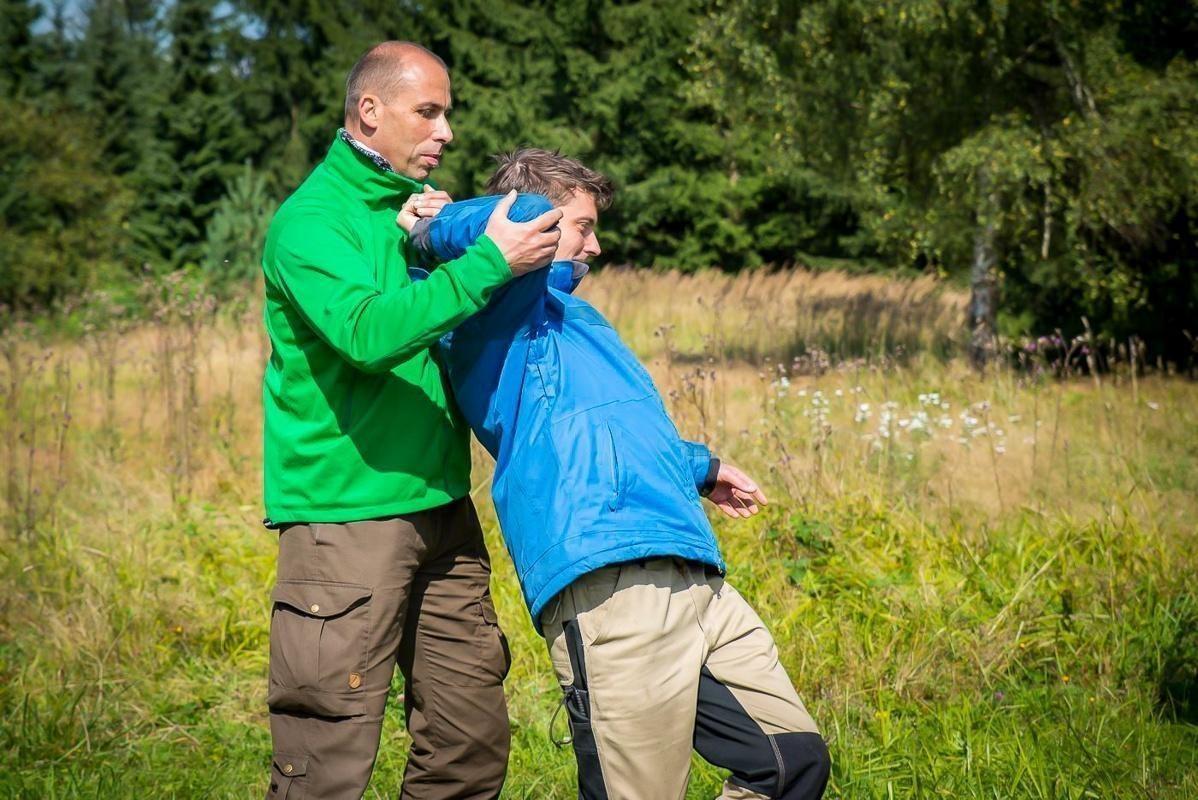 Zwei Personen üben eine Selbstverteidigungstechnik im hohen Gras