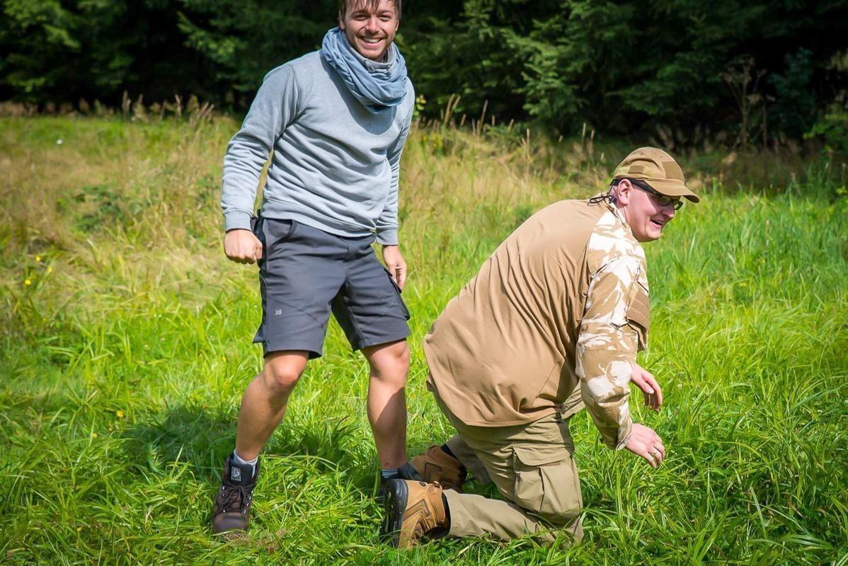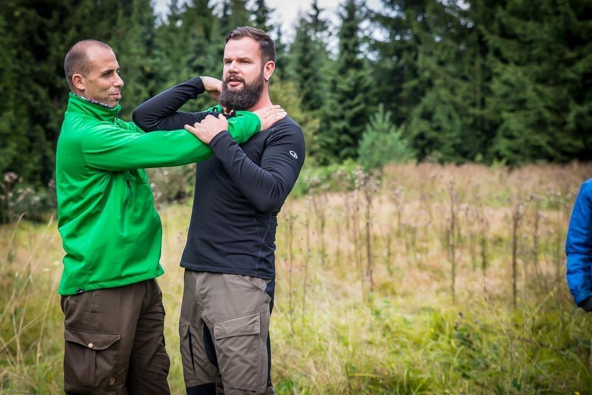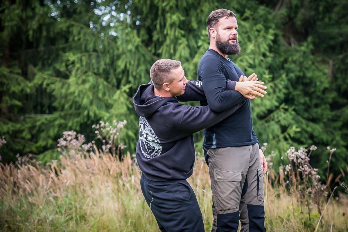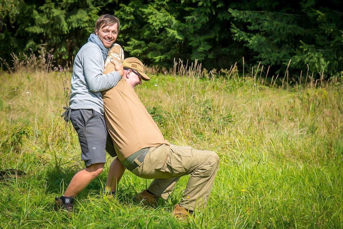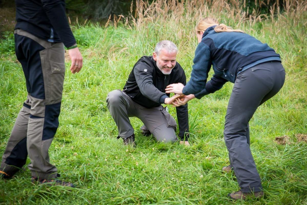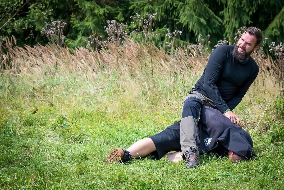 Zwei Personen üben eine Selbstverteidigungstechnik im hohen Gras